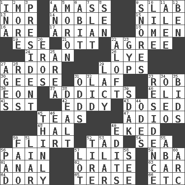 ACROSS 1. Mischievous child 4. Collect or gather 9. Broad, flat, thick piece 13. And not 14. Having high moral qualities 15. Mediterranean tributary 16. "We ___ not amused" (Victoria) 17. Believer in; advocate of (suffix) 18. Sign of something about to happen 19. Compass dir. 21. Baseball player Mel 22. Match 24. SW Asia republic 26. Sodium hydroxide 27. Zeal 29. Chops off 30. Honkers 31. Norwegian king 33. Director Reiner 36. Period of immesurable duration 37. Inveterate users 40. Connecticut Ivy Leaguer 41. Fast jet (abbr.) 42. Whirlpool 43. Administered medicine 45. Beverages made from leaves 47. Goodbye (Sp.) 48. Actor Linden 49. Made supply last 50. Talk or behave amorously 52. Small amount or degree 54. Ocean 56. Ache 57. Ms. Damita and namesakes 59. Basketball assoc. 61. Of or related to the anus 62. Declaim 63. Automobile 64. Small, narrow, flatbottom fishing boat 65. Laconic 66. And so on (abbr.) DOWN 1. _ tizzy (2 wds.) 2. Greater amount 3. Elected leader of a country 4. Santa ___, CA 5. Person of subnormal intelligence 6. "This won't hurt ____!" 7. Narrow board 8. Elected rep. 9. Sounds asleep 10. Citrus frut 11. Toward shelter 12. Benjamin's nick name 20. Greek god of love 22. Upward 23. Hustle 25. Type of rug 27. Ripens 28. Vintage cars 29. Made of lace 31. Likelihood 32. Flaplike covering 33. Home 34. Butter sub 35. Auction offers 38. Started a card game 39. Neighbor of Neb. 44. Lyric poems 45. Without force or sincere effort 46. Ewer handle 49. Prepares for publication 50. Papal veil 51. One who doesn't tell the truth 52. Hoop that covers a wheel 53. Having or resembling wings 55. Blind as ____ 56. Writing tablet 57. Car dealer's back yard 58. Perceive with the eye 60. Curve