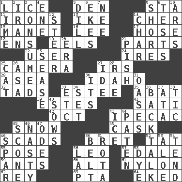 ACROSS 1. Louse (plural) 5. Lair 8. R.R. building 11. Removes the wrinkles 13. Mamie's mate 14. "Mermaids" star 15. French painter Edouard 16. Area sheltered from the wind 17. Flexible conduit 18. Followers of ems 19. Snakelike fish 21. Components 22. One who makes use of a thing 24. Angers 25. Device for capturing images 27. Big collection agency 29. At sea 30. Potato state 32. Small boys 33. First name in cosmetics 35. Blind as ____ 39. _____ Park, CO 41. Suttee (variant) 42. Sep. follower 43. Medicinal drug used to evoke vomiting 45. Overwhelm 48. Keg 49. Heaps 50. Cy Young winner Saberhagen 52. Make lace 55. Introduce or present, as a question 56. Lion 57. Peak District village in England 59. Pismires 60. The first octave above the treble staff 61. High-strength synthetic material 62. Marina Del _, California 63. Parent Teacher Association (abbr.) 64. Made supply last DOWN 1. Citrus frut 2. SW Asia republic 3. Eaten 4. Compass dir. 5. Deli pickle 6. Supplements with great effort 7. Born 8. Dinah or Pauly 9. Trials 10. Ancient Greek god of war 12. Bull 14. Burn to charcoal 20. Period 21. Expression of disdain 23. Gospel singer Marvin 25. Domesticated feline 26. White ___ sheet 27. Binary compound 28. Actress Charlotte 30. It is 31. Fertile tracts in a desert 33. And so on (abbr.) 34. Arrange properly for use 36. Sass 37. _ moment's notice (2 wds.) 38. Nervous spasm 40. Sty mamas 43. Frozen water 44. Eucharist need 45. Biscuitlike quick bread 46. Difficult 47. Lyric poems 49. Coast Guard woman 50. Waist strap 51. Roll call or roster of names 53. _ vera 54. Be inclined (to) 56. Pet locale 58. Color