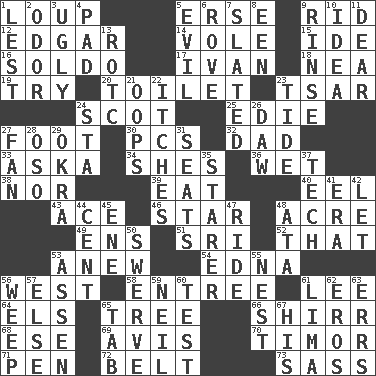 ACROSS 1. Central Nebraska county 5. Celtic language 9. To free from 12. _ Allan Poe 14. Grand slam 15. Binary compound 16. Twentieth part of a lira 17. _ the terrible 18. Teachers' org. 19. Attempt to accomplish something 20. Bathroom 23. Russian ruler of old 24. Native of Scotland 25. Singer Brickell 27. Pick up the tab 30. Personal Computers (abbr.) 32. June honoree 33. "____ silly question..." 34. "______ My Girl" (Turtles hit) 36. Dripping 38. And not 39. Ingest 40. Snakelike fish 43. Adept person 46. Play the lead 48. 43,560 square feet 49. Followers of ems 51. Indian title of respect (Mr.) 52. Not this but _ 53. Afresh 54. Pulitzer Prize-winning author Ferber 56. 270 degrees 58. Main course 61. Area sheltered from the wind 64. Raised railways 65. Woody plant 66. Bake eggs in their shells 68. Compass dir. 69. Opinion 70. The easternmost of the Lesser Sundas 71. Writing instrument 72. Waist strap 73. Backtalk DOWN 1. For fear that 2. Aroma 3. Repulsive 4. Groovy apt. 5. Tending to cause great harm 6. Be footloose 7. Scheduled 8. Car or cant ending 9. Remove soap 10. The content of cognition 11. Letter starter 13. College mil. group 21. I made a mistake 22. Irritating cutaneous sensations 23. Periodic rise and fall of the sea level 24. R.R. building 26. Obsolete 27. Avid follower 28. Bear (Spanish) 29. Gumbo ingredient 31. Theater features 35. A viewer who gazes fixedly 37. Georgia ____ (Atlanta school) 41. Epoch 42. Allow 44. Penny 45. Compass dir. 47. Travel on or in a vehicle 48. "One Day ___ Time" 50. Turn aside suddenly 53. NE Netherlands city 55. A home for chicks 56. Shed a tear 57. Otherwise 59. Famous astronaut Armstrong 60. Trial 61. Pale green bean 62. Greek god of love 63. Blunders 65. Keyboard key 67. Part of HMS, perhaps