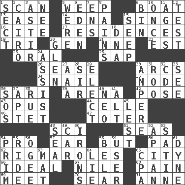 ACROSS 1. Examine minutely or intensely 5. Shed a tear 9. Water vessel 13. Relaxation 14. Pulitzer Prize-winning author Ferber 15. Scorch 16. Quote 17. Homes 19. Three (prefix) 20. Commissioned military rank (abbr.) 21. Compass dir. 22. Eastern Standard Time (abbr.) 23. Relating to the mouth 25. Plant excrement 26. Gospel singer Marvin 30. Curves 34. Slow-paced one 35. Method 36. Indian skirt 39. Sports stadium 42. Introduce or present, as a question 43. Musical composition 44. Cell (Danish) 46. Proofreading order 47. Carrier 48. _-fi 51. Oceans 54. Adept person 57. Ewer handle 58. Yet 60. Writing tablet 62. Complicated, petty procedures 65. Municipality 66. Perfect 67. Mediterranean tributary 68. Ache 69. Rendezvous 70. Scorch 71. Singer Murray DOWN 1. Religious group 2. Capital of Egypt 3. Moving or stirring 4. Born 5. We are 6. Paradise 7. Followers of ems 8. Aches 9. Storage container 10. Single time 11. Ripens 12. Trial 15. Ooze 18. Heredity factor (abbr.) 20. Small, secluded valley 24. Aid 27. Auto club (abbr.) 28. Title for a knight 29. Choose 30. Electrical Unit 31. Friend of Pooh 32. Music discs 33. Observe 36. Distress signal 37. Fitting 38. Regret 40. Modern: prefix 41. Keyboard modifier key 45. For fear that 48. Lick closed 49. Auto 50. Metal shackles 52. Bee-related 53. Smooth fabric 54. Demure 55. Travel on or in a vehicle 56. Double curve, resembling the letter S 58. Actor Lugosi 59. One who makes use of a thing 61. Unit of force 63. Floor protector 64. Whopper 65. Tax preparer (abbr.)