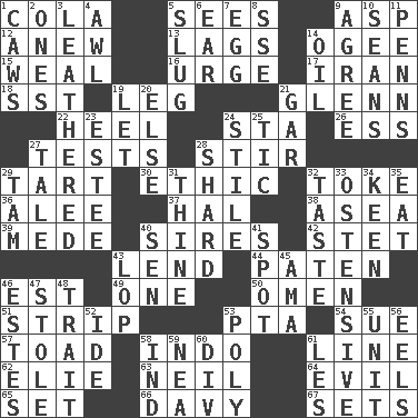 ACROSS 1. Root beer relative 5. Observes 9. Viper 12. Afresh 13. Falls behind 14. Double curve, resembling the letter S 15. Welt 16. Goad 17. SW Asia republic 18. Fast jet (abbr.) 19. Part of a journey 21. American astronaut and politician John 22. The bottom of a shoe or boot 24. R.R. building 26. Curvy letter 27. Trials 28. Agitate 29. Small pie 30. Principle of right and wrong 32. Casino tip 36. Toward shelter 37. Actor Linden 38. Toward the sea 39. Ancient Persian 40. Founders of families 42. Proofreading order 43. Grant temporary use of 44. Eucharist need 46. Eastern Standard Time (abbr.) 49. Single 50. Presage 51. Remove all contents or possession from 53. Parent Teacher Association (abbr.) 54. Take to court 57. Frog relative 58. _ china 61. Actor's bit 62. Writer Wiesel 63. Famous astronaut Armstrong 64. Tending to cause great harm 65. Put into a specified state 66. _ Jones' Locker 67. Arranges properly for use DOWN 1. Crow sounds 2. Washington bills 3. Tough but pliablecoriaceous 4. Leather borer 5. Snaillike creature with no shell 6. Ewer handle 7. Ovum 8. Compass dir. 9. Match 10. Seines 11. Actor Sean's family 14. Lubricate 19. Allow 20. Otherwise 21. Slender fish 23. First name in cosmetics 24. Vertical member of a panel or frame 25. Nervous spasm 27. Falsehood 28. Broken piece 29. Scottish cap 31. One or ones belonging to thee 32. Clothes sense 33. Clearly or manifestly demonstrative 34. Peachy ____! 35. Erode 40. Elected rep. 41. Blemish 43. Trim (branches) 45. Nanny (var.) 46. _____ Park, CO 47. Fur scarf 48. Distinguishing feature 52. Binary compound 53. More than one (prefix) 55. A single undivided whole 56. Snakelike fish 58. Indiana (abbr.) 59. Teachers' org. 60. HTML Container Element 61. French article