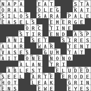 ACROSS 1. California wine valley 5. Erode 8. R.R. building 11. Spoken 12. Cassini of fashion 14. Krazy ___ of comics 15. Grain storage towers 17. "Two Mules for Sister ____" 18. Light colored 19. Artist's stands 21. Develop 23. The grampus (Milton) 25. Prong on a fork 26. Commotion 27. Conclude 28. Cleo's killer 31. Cuckoo 33. Put into a specified state 35. Fathers 37. Having or resembling wings 38. Armed conflict 40. Portable shelter 41. Flower holders 43. Chewing product 45. Make lace 46. Small island 47. Single 50. Words to Nanette 52. Actor Alda or Thicke 53. Three (prefix) 54. Most capable 56. Dodged 61. Stitch closed the eyes of (a falcon) 62. Johnson of "Laugh-In" 65. Eat (away) 66. Being at a high temperature 67. Path through which fluid escapes 68. Amused look 69. Followers of ems 70. She-sheep 71. Snake ____ (dice throw) DOWN 1. Olfactory organ 2. Roberta Peters solo 3. Friends 4. _ vera 5. Greek goddess of the dawn 6. According to 7. Cigar-shaped 8. Heroin 9. Story 10. Had dinner 13. Street urchin 16. Narrow opening 18. Before (prefix) 20. Indian titles of respect 22. Conclusions 24. Ship's personnel 26. Title for a man of rank and authority 28. Type of rug 29. Posted 30. Pacific Standard Time (abbr.) 31. Mountain range southwest of Kyrgyzstan 32. Political cartoonist Thomas 34. Label 36. "Tell ____ the Marines!" 37. Actress Gardner 39. Undersized animal 42. Not divided or shared with others 44. Greater amount 48. Rhinal 49. Main course 51. Mediterranean tributary 52. Everything 54. A really long time 55. Wagers 57. Goad 58. Rowboat 59. Singer Brickell 60. Hiding places for outlaws 61. A female animal or person 63. The 23rd letter of the Hebrew alphabet 64. Supplement with great effort