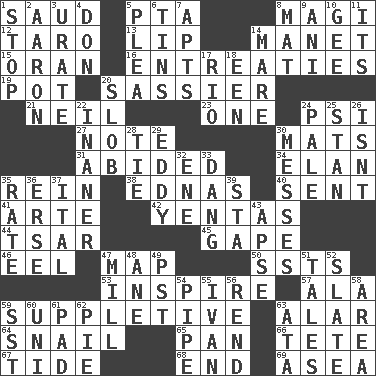 ACROSS 1. Saudi Arabian king (1953-1964) 5. Parent Teacher Assoc. 8. Wise men 12. Edible starchy tuberous root 13. Mouth edge 14. French painter Edouard 15. NW Algerian seaport 16. Pleas 19. Plant holder 20. More impudent 21. Famous astronaut Armstrong 23. Single 24. 23rd letter of the Greek alphabet 27. Musical sound 30. Floor coverings 31. Tolerated 34. Flair 35. It's straight from the horse's mouth 38. Ferber et al. 40. Transmitted 41. Johnson of "Laugh-In" 42. Gossips 44. Russian ruler of old 45. Yawn 46. Snakelike fish 47. Atlas unit 50. Fast planes 53. Motivate 57. Wing 59. Supplying deficiencies 63. Having or resembling wings 64. Slow-paced one 65. Baking dish 66. False hair 67. Periodic rise and fall of the sea level 68. Conclusion 69. At sea DOWN 1. Halt 2. Composer Copland 3. A salt of uric acid 4. Spanish title 5. Entreaty 6. Canisters 7. Flats, for short 8. Floor covering 9. Black tropical American cuckoo 10. Unit of force equal to gravity 11. ___ a Wonderful Life 14. Female horse 17. River (Sp.) 18. Car or cant ending 20. Oscar Madison type 22. Sillier 24. Diluted with white 25. Comedian Laurel of Laurel & Hardy 26. Is not 28. Neckwear 29. Whirlpool 30. Makes clutter 32. Compass dir. 33. Mild oath, euphamism for damn 35. Pace 36. Celtic language 37. Slanted text style (abbr.) 39. R.R. building 43. Domed church section 47. Place where flour is made 48. One (Scot) 49. Pacific Standard Time (abbr.) 51. Falsehoods 52. Chalkboard 54. Corncob 55. "Terrible" tsar 56. Tear apart 58. Type of rug 59. Fast jet (abbr.) 60. University (slang) 61. Groovy apt. 62. Sliced dessert 63. "One Day ___ Time"