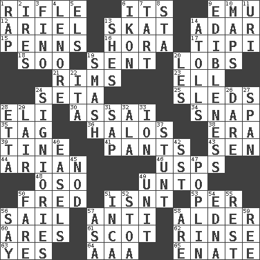 ACROSS 1. Firearm 6. ___ a Wonderful Life 9. Australian flightless bird 12. Satellite of Uranus 13. Three-handed card game 14. The sixth month of the Jewish calendar 15. Actor Sean's family 16. Israeli folk dance 17. Native american tent (variation) 18. "Barney Miller" actor Jack 19. Posted 20. Tennis shots 21. Basketball hoops 23. Pipe bend 24. Bristle 25. Bobsleighs 28. Biblical high priest 30. Slender Brazilian palm 34. Fastener 35. Label 36. Auras 38. Epoch 39. Prong on a fork 41. Leg coverings 43. Elected rep. 44. Believer in; advocate of (suffix) 46. United States Postal Service (abbr.) 48. Bear (Spanish) 49. To (old English) 50. Flintstone 51. Is not 53. For each 56. Travel by water 57. Against 58. Tree or shrub in the Birch family 60. Ancient Greek god of war 61. Native of Scotland 62. Wash lightly 63. Affirmative reply 64. Auto club (abbr.) 65. Related on the mother's side DOWN 1. Hit sharply and swiftly 2. Angers 3. A pale, very dry sherry 4. Poe poem 5. Raised railways 6. Image 7. Small pie 8. R.R. building 9. The property of being fit to eat 10. Atlas contents 11. RI univ. 13. "______ My Girl" (Turtles hit) 14. Ringlike coral islands and reefs 19. Box-office sellout 20. French article 22. Call ___ day 24. Seigniories (variant) 26. Have the gumption 27. Connect, as a bridge 28. Singer James 29. Den 31. Plant excrement 32. Insect wing 33. Electrically charged atom 37. Check the growth or development of 40. Artist's stands 42. Fast jet (abbr.) 45. Dreamland 47. Cotton for raincoats, e.g. 49. A single undivided whole 50. Conductor's collection 51. South American Indian 52. Portico 54. Pulitzer Prize-winning author Ferber 55. Relief 56. Declare 57. White ___ sheet 58. "We ___ not amused" (Victoria) 59. To riddle