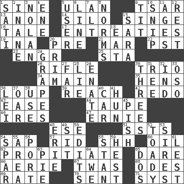 ACROSS 1. Trig term 5. ____ Bator, Mongolia 9. Russian ruler of old 13. At once, immediately (arch.) 14. Grain storage tower 15. Scorch 16. Story 17. Pleas 19. _ tizzy (2 wds.) 20. Before (prefix) 21. Third mo. 22. Pacific Standard Time (abbr.) 23. Engineer (abbr.) 25. R.R. building 26. Ransack; plunder; pillage 30. Musical group of three 34. At full speed 35. Coop moms 36. Central Nebraska county 39. Arrive at 42. Make new 43. Comfort 44. Grayish beige 46. Angers 47. Bert's buddy 48. Compass dir. 51. Fast planes 54. Plant excrement 57. To free from 58. Quiet! 60. Lubricate 62. Appease 65. Have the gumption 66. Nest on high 67. It was, poetically 68. Lyric poems 69. Pace 70. Transmitted 71. System (abbr.) DOWN 1. Suttee (variant) 2. Empty; void 3. Pitcher Ryan 4. Compass dir. 5. One who uses or employs something 6. Actor's bit 7. The first octave above the treble staff 8. Typical standards 9. Teat (slang) 10. Sever or remove by pinching or nipping 11. Eons 12. Remainder 15. "Two Mules for Sister ____" 18. Ingest 20. Demure 24. Wine fruits 27. Distant 28. Untruth 29. Maternal 30. Triplets 31. To riddle 32. Indiana (abbr.) 33. Bear (Spanish) 36. Flowery wreath 37. Boat paddle 38. Purpose 40. Auto 41. Attila the _ 45. Expression of disdain 48. One of the Great Lakes 49. Be seated 50. Prepares for publication 52. Sycophant 53. Fathers 54. Practice fight 55. Length times width 56. Sweet dark-red dessert wine 58. Comedian Laurel of Laurel & Hardy 59. Command 61. For fear that 63. Sliced dessert 64. Deep reverence 65. Two (Sp.)