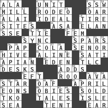 ACROSS 1. Chicken ___ king 4. A single undivided whole 8. Compass dir. 11. Place where flour is made 13. Cowboy competition 15. Boat paddle 16. Jai _ 17. Perfect 18. Become fatigued 19. Locates 21. White ___ sheet 22. Liveliness 23. Compass dir. 24. Make a knot 27. Opposite of masc. 29. Synchronize (abbr.) 30. Practice fights 34. Infant food 36. Root beer relative 39. Sir (Sp.) 40. Hub of activity 41. Place in a line 43. Suttee (variant) 44. Bee-related 46. Genesis locale 47. Affectionate concern, for short 48. Writing tables 49. Does sums 51. Bank Draft (abbr.) 53. Friend of Pooh 54. Actress Gardner 57. Play the lead 60. Clumsy lout 63. Showery time 65. Immeasurably long periods of time 66. Off-Broadway awards 69. Exchanged or delivered for money 70. Ring climax 71. Lies 72. Capri or Wight 73. Ocean 74. Portable shelter 75. Ewer handle DOWN 1. Collect or gather 2. Ms. Damita and namesakes 3. Having winglike extensions 4. RI univ. 5. Dreamland 6. The main thing one is thinking about 7. Beverages made from leaves 8. Land 9. "Two Mules for Sister ____" 10. Songbird 12. Whopper 14. Norwegian king 18. Storms 20. Filthy place 25. South American Indian 26. Learning spot: Fr. 28. Curvy letter 29. Orators 31. Of or related to the anus 32. College mil. group 33. _ Lanka 34. Corncob 35. Opinion 37. Flaplike covering 38. Approach 40. Possessed 42. Inside; within (prefix) 45. Overdraft (abbr.) 50. ___ good deed 52. A blast of a horn 54. Came up 55. Country estate 56. Tree or shrub in the Birch family 57. Arranges properly for use 58. Casino tip 59. Small Philippine buffalo 61. Blind as ____ 62. Do some clerical work 64. Air pressure measure (abbr.) 67. Car or cant ending 68. Fast jet (abbr.)