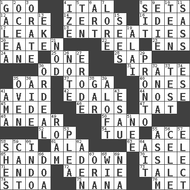 ACROSS 1. Thick or sticky substance 4. Slanted text style (abbr.) 8. Arranges properly for use 12. 43,560 square feet 14. Nothings 16. The main thing one is thinking about 17. Path through which fluid escapes 18. Pleas 20. Eroded 22. Snakelike fish 23. Followers of ems 24. One (Scot) 25. Single 28. Plant excrement 30. Aroma 31. Feeling or showing extreme anger 35. Boat paddle 37. Ancient Roman robe 40. Washington bills 41. Enthusiastic 42. Peak District village in England 44. Sense of smell 45. Ancient Persian 46. Greek god of love 47. Make lace 48. Approach 50. Papal veil 52. Trim (branches) 54. Third day of the wk. 55. Adept person 58. _-fi 61. Chicken ___ king 63. Artist's stand 65. Sleeping bag shop? 70. Small island 71. Inside; within (prefix) 72. Nest on high 73. Baby powder 74. Portico 75. Grandmother 76. Was introduced to DOWN 1. An organ shaped like a helmet 2. Sea 3. Declaim 4. Ending with capital 5. "___ Little Indians" 6. Tate display 7. Old wives' tales, e.g. 8. Be seated 9. Singer Brickell 10. Adolescent 11. Backtalk 13. Make supply last 15. Observes 19. Jai ____ 21. Dreamland 26. Musical sound 27. Eat (away) 29. Right away 30. Severe or trying experience 32. Small Philippine buffalo 33. Trial 34. Compass dir. 35. Baking chamber 36. Assistant 38. Slender fish 39. At or to great height 41. Nursemaid (var.) 43. Son of Isaac 49. Wander aimlessly 51. Born 53. Entreaty 55. Indian state 56. Cell (Danish) 57. Voters do this 58. "______ My Girl" (Turtles hit) 59. Patter 60. Southeast Asian peninsula 62. An important port of Yemen 64. Small island 66. ___ good deed 67. Mouth or opening 68. Victory 69. Teachers' org.