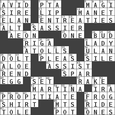 ACROSS 1. Enthusiastic 5. Parent Teacher Association (abbr.) 8. Wise men 12. The founder of a family 13. Mouth edge 14. French painter Edouard 15. Enthusiasm 16. Pleas 19. Keyboard modifier key 20. More lively and spirited 21. A really long time 23. Single 24. Partially opened flower 27. Capital of Latvia 30. Kenny Rogers chart-topper in '80 31. Ringlike coral islands and reefs 34. Uhlan (variant) 35. Dunce 38. Entreaties 40. Filth; sediment 41. Medicinal plant 42. Help 44. Tear apart 45. Coast Guard woman 46. Oval reproductive body of a fowl 47. Arrange properly for use 50. Immoral or dissolute person 53. Chrissie's court nemesis 57. Lyricist Gershwin 59. Appease 63. Toadlike animal 64. Upper-body garment 65. Mountains (abbr.) 66. Travel on or in a vehicle 67. Lacquered or enameled metalware 68. Cooking vessel 69. Singles DOWN 1. Toward the sea 2. Country residence 3. Feeling or showing extreme anger 4. Lair 5. Entreaty 6. Airtight sealed metal containers 7. Flats, for short 8. Floor covering 9. Black tropical American cuckoo 10. Turn to the right 11. ___ a Wonderful Life 14. Female horse 17. River (Sp.) 18. Car or cant ending 20. In a ____ (agitated or irritated) 22. Declaimed 24. Indonesian resort city 25. Hereditary estate 26. Centimeter-gram-second unit of force 28. Republican Party 29. Silent film actress Nazimova 30. A period of five years 32. French article 33. Backtalk 35. Have the gumption 36. Cassini of fashion 37. Yearn 39. Small drink 43. "Two Mules for Sister ____" 47. Stricken, poetically 48. Ingest 49. Three (prefix) 51. Japanese brewing company 52. Wear away 54. Pack (down) 55. "Tell ____ the Marines!" 56. A home for chicks 58. Grows older 59. Pacific Standard Time (abbr.) 60. 17th letter of the Greek alphabet 61. Petroleum 62. Before (prefix) 63. Away