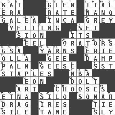 ACROSS 1. Krazy ___ of comics 4. Small, secluded valley 8. Slanted text style (abbr.) 12. Period 13. Assign a rank or rating to 14. Billionth: prefix 15. An organ shaped like a helmet 18. South American Indian 19. Jennifer or Joel 20. Crying or shouting loudly 22. Arrange properly for use 23. The Jewish people; Israel 24. ___ a Wonderful Life 25. Snakelike fish 26. Speakers 30. Girls' org. (abbr.) 33. Tall tales 36. 4th largest of the Great Lakes 37. Rounded earthenware pot or jar 39. Turn to the right 40. Moist 41. Inside of hand 42. Honkers 44. Fast jet (abbr.) 45. Paper fasteners 47. Basketball assoc. 50. Period of immesurable duration 51. Dunce 53. Tate display 54. Opts 57. Inactive volcano in Sicily 59. Grain storage tower 61. Underwater navigation system 63. To trail on the ground 64. Angers 65. Neckwear 66. Filth; sediment 67. Not wild 68. Playfully artful DOWN 1. Barrel 2. Like ___ of sunshine 3. Stories 4. Broad smile 5. Long (Scottish) 6. And so on (abbr.) 7. Teachers' org. 8. Swallowed 9. Small pie 10. A saturated hydrocarbon 11. Myrna of the movies 16. Writer Wiesel 17. Medicinal plant 21. In an inward manner 22. R.R. building 24. Big collection agency 26. Washington bills 27. Mouths or openings 28. Basketball hoops 29. Back-to-school mo. 30. Republicans 31. Narrow board 32. Silent film actress Nazimova 34. Matures 35. To riddle 38. Electrical Measurement 42. Commissioned military rank (abbr.) 43. Inside; within (prefix) 46. Car dealer's back yard 48. Scornful sounds 49. In addition 52. Portable shelters 53. Of or related to the anus 54. Clement's nick name 55. Stockings 56. Move on water 57. Begley and Asner 58. Three (prefix) 59. Be seated 60. Lyricist Gershwin 62. Marina Del _, California