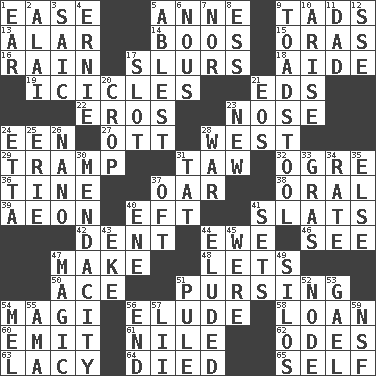 ACROSS 1. Relaxation 5. Singer Murray 9. Small boys 13. Having or resembling wings 14. Scornful sounds 15. Mouths or openings 16. Precipitation 17. Runs notes together 18. Helper 19. Winter's stalactites 21. Begley and Asner 22. Greek god of love 23. Sense of smell 24. Car or cant ending 27. Baseball player Mel 28. 270 degrees 29. _____ steamer (cargo ship) 31. The 23rd letter of the Hebrew alphabet 32. Legendary monster 36. Prong on a fork 37. Rowing implement 38. Taken by mouth 39. A really long time 40. Lizard (obsolete) 41. Narrow boards 42. Undesirable depression on a surface 44. She-sheep 46. Observe 47. Create 48. Allows 50. Adept person 51. Puckering 54. Wise men 56. Evade 58. Grant temporary use of 60. Send forth 61. The longest river in the world 62. Lyric poems 63. Made of lace 64. Passed on 65. Oneself DOWN 1. Ewer handle 2. Jai ____ 3. Ketch in the Levant 4. Bert's buddy 5. Most capable 6. Common sense 7. Not either 8. Curvy letter 9. Inedible or poisonous agaric 10. Ascend 11. June honoree 12. Compass dir. 17. Groove 20. Riding implement 21. Greek goddess of the dawn 23. ___ Haven, CT 24. Singer James 25. 4th largest of the Great Lakes 26. Billionth: prefix 28. Armed conflict 30. Ananias' fault 31. Make lace 33. Pate de foie ____ 34. Assign a rank or rating to 35. Otherwise 37. Often (poetically) 40. Compass dir. 41. Puts into a specified state 43. Make supply last 44. Evaded 45. We are 47. Mysterious quality of enchantment 49. Grain storage towers 51. Whimper 52. Connecting point 53. Highlander 54. Cartoonist voice _ Blanc 55. Nursemaid (var.) 56. Conclude 57. Cards in a Roman deck? 59. Overdraft (abbr.)