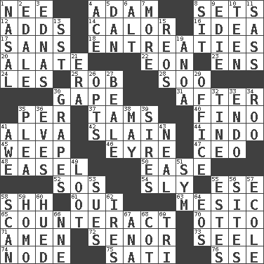 ACROSS 1. Born 4. First of billions? 8. Puts into a specified state 12. Sums up 14. Bodily heat indicating an inflammation 16. The main thing one is thinking about 17. Without 18. Pleas 20. Having winglike extensions 22. Period of immesurable duration 23. Followers of ems 24. French article 25. Director Reiner 28. "Barney Miller" actor Jack 30. Stare wonderingly 31. Following 35. For each 37. Scottish caps 40. A pale, very dry sherry 41. Inventor's middle name 42. Killed 44. Southeast Asian peninsula 45. Shed a tear 46. Jane of fiction 47. Corporate head (abbr.) 48. Artist's stand 50. Comfort 52. Mayday 54. Stealthy 55. Compass dir. 58. Quiet! 61. Fr. "Yes" 63. Mesonic 65. Frustrate 70. "Beetle Bailey" pooch 71. So be it 72. Sir (Sp.) 73. Stitch closed the eyes of (a falcon) 74. Thickened enlargement 75. Suttee (variant) 76. Compass dir. DOWN 1. Relating to the nose 2. Peak District village in England 3. Ferber et al. 4. Adept person 5. Daniel's nick name 6. Keyboard modifier key 7. Greater amount 8. Be seated 9. Singer Brickell 10. Adolescent 11. Backtalk 13. Fast jet (abbr.) 15. Vintage cars 19. Small Philippine buffalo 21. Epoch 26. Chooses 27. Memphis, Tenn. Street 29. Place of business 30. Wine fruits 32. Prong on a fork 33. Inside; within (prefix) 34. Friend of Pooh 35. Entreaty 36. Nights before holidays 38. Fifth month 39. Begets 41. Deep reverence 43. Be tempered by heat 49. Plunder 51. Symbol (abbr.) 53. Takes to court 55. _____ Park, CO 56. Settings 57. Learning spot: Fr. 58. Skim 59. Same (prefix) 60. Became colored 62. Angers 64. Greek goddess of the dawn 66. Compass dir. 67. Santa ___, CA 68. Small bed 69. Three (prefix)