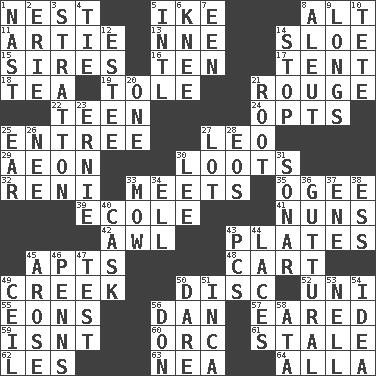 ACROSS 1. Egg locale 5. Eisenhower's nickname 8. Keyboard modifier key 11. Nick name for Arthur 13. Compass dir. 14. _ gin 15. Founders of families 16. "___ Little Indians" 17. Portable shelter 18. Beverage made from leaves 19. Lacquered or enameled metalware 21. Makeup applied to the cheeks 22. Adolescent 24. Elects 25. Main course 27. Lion 29. A really long time 30. Plunders 32. Painter Guido (1575-1642) 33. Confronts 35. Double curve, resembling the letter S 39. Learning spot: Fr. 41. Religious women 42. Leather borer 43. Food holders 45. Flats, for short 48. Draw slowly or heavily 49. Small stream 50. Compact _ 52. University (slang) 55. Immeasurably long periods of time 56. Daniel's nick name 57. Having ears or earlike features 59. Is not 60. The grampus (Milton) 61. Having lost freshness 62. French article 63. Teachers' org. 64. Silent film actress Nazimova DOWN 1. Political cartoonist Thomas 2. 4th largest of the Great Lakes 3. Ski resort town in Vermont 4. Make a knot 5. International (abbr.) 6. Leg joint 7. Car or cant ending 8. Eskimo relative 9. Yearns 10. Wig 12. First name in cosmetics 14. Obstruct or block passage 20. Single 21. Carrot, for example 23. Bert's buddy 25. Hearing organ 26. Born 27. Car dealer's back yard 28. Greek goddess of the dawn 30. Area sheltered from the wind 31. Underwater navigation system 33. Cut the grass 34. Pipe bend 36. From the throat 37. Compass dir. 38. Double-curved letter 40. Keg 43. Personal Computers (abbr.) 44. Shoestrings 45. Came up 46. Actor Sean's family 47. Trial 49. To provide with a ceiling 50. Have the gumption 51. South American Indian 53. 1994 drama film starring Jodie Foster 54. It may be bright or harebrained 56. Spanish title 58. _ moment's notice (2 wds.)