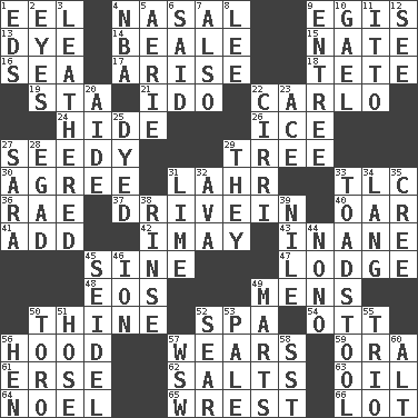 ACROSS 1. Snakelike fish 4. Rhinal 9. Armor plate that protects the chest 13. Color 14. Calif. Air Force Base 15. Nathan's nickname 16. Ocean 17. Get up 18. Wig 19. R.R. building 21. Wedding promise 22. Monte _, Las Vegas Hotel/Casino 24. Flintstone garb 26. Frozen water 27. Sleazy 29. Family _ (genealogy) 30. Match 31. Cowardly lion portrayer 33. Affectionate concern, for short 36. Actress Charlotte 37. Popular '50s hangout 40. Boat paddle 41. Find the sum of 42. "If ____ say so..." 43. Empty; void 45. Trig term 47. Cabin 48. Greek goddess of the dawn 49. Not women's 50. One or ones belonging to thee 52. Health resort 54. Baseball player Mel 56. Parka part 57. Erodes 59. Mouth or opening 61. Celtic language 62. Table seasonings 63. Petroleum 64. Christmas carol 65. Obtain by seizing forcibly or violently 66. Car dealer's back yard DOWN 1. Begley and Asner 2. Sight organs 3. Resembling or made to resemble leather 4. Basketball assoc. 5. Nest on high 6. Alleged 7. In addition 8. Area sheltered from the wind 9. Main course 10. Highlander 11. "Tell ____ the Marines!" 12. Perceive with the eye 20. Assistant 22. High-altitude cloud 23. Adept person 25. Colored 27. "Two Mules for Sister ____" 28. Mild oath 29. Those people 31. Citrus frut 32. Actress Gardner 33. Inedible or poisonous agaric 34. Austrian-born American filmmaker Fritz 35. Algonquian 38. Remove soap 39. Mediterranean tributary 44. Words to Nanette 45. Beer mug 46. Electrically charged atom 49. Shops 50. "Corrida" creature 51. Stockings 52. Scorch 53. Diluted with white 55. Musical group of three 56. Layer 57. Compass dir. 58. Fast jet (abbr.) 60. The first octave above the treble staff