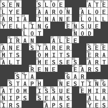 ACROSS 1. Elected rep. 4. _ gin 8. Had dinner 11. Sodium hydroxide 12. Composer Copland 14. Medicinal plant 15. Roberta Peters solo 17. Silly 18. Hang loosely or laxly 19. Crying or shouting loudly 21. Follow as a consequence or result 23. Car dealer's back yard 24. Allow head to fall sleepily 25. SW Asia republic 27. Toward shelter 30. One (Scot) 31. A viewer who gazes fixedly 34. Perceive with the eye 37. Mountains (abbr.) 38. Leaves out 39. Period 40. Keyboard modifier key 41. Makes clutter 43. Tate display 44. French philosopher Descartes 45. Hearing organs 47. R.R. building 49. Slender fish 50. Staphylococcus 52. Snuggling 56. Tiny particle 57. Come out of 60. Independent ruler or chieftain 61. Pinches, bites 62. Actors Connery and Penn 63. Insect wing 64. Big collection agency 65. Domed church section 66. It is so DOWN 1. Kill 2. Jane of fiction 3. Famous astronaut Armstrong 4. Inhabitant of Heaven 5. Long (Scottish) 6. Mouth or opening 7. A really long time 8. Verbally 9. Lacquered or enameled metalware 10. Snakelike fish 13. Born 14. In addition 16. Silent film actress Nazimova 20. Charged atoms 22. Compass dir. 25. International (abbr.) 26. Remainder 27. Get up 28. Allows 29. Celtic language 30. Nursemaid (var.) 32. Heavy book 33. So be it 34. Singe 35. Blunders 36. Consume 42. Oceans 44. Hit sharply and swiftly 46. Johnson of "Laugh-In" 47. Halts 48. Scottish caps 49. Honkers 50. Commotion 51. Part of HMS, perhaps 52. Religious women 53. "If ____ say so..." 54. Mediterranean tributary 55. Pate de foie ____ 56. Black tropical American cuckoo 58. Ocean 59. Plant excrement