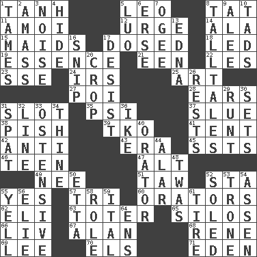 ACROSS 1. Hyperbolic tangent 5. Lion 8. Make lace 11. Mine, in Marseilles 12. Goad 14. Insect wing 15. Women servants 17. Administered medicine 18. Directed 19. Substance 21. Car or cant ending 22. French article 23. Compass dir. 24. Big collection agency 25. Tate display 27. Luau course 28. Hearing organs 31. Notch 35. 23rd letter of the Greek alphabet 37. Turn sharply 38. Expression of disdain 39. Ring climax 41. Portable shelter 42. Against 43. Period 45. Fast planes 46. Adolescent 47. Keyboard modifier key 49. Born 51. The 23rd letter of the Hebrew alphabet 52. R.R. building 55. Affirmative reply 57. Three (prefix) 60. Speakers 62. Biblical high priest 63. Carrier 65. Grain storage towers 66. 54 in ancient Rome 67. ____ Jay Lerner 68. French philosopher Descartes 69. Area sheltered from the wind 70. Raised railways 71. Locale of original sin DOWN 1. Corrects by punishment or discipline 2. Collect or gather 3. Annoying sound 4. Flintstone garb 5. Nilotic language 6. Celtic language 7. Double curve, resembling the letter S 8. Baron Munchausen's specialties 9. Toward shelter 10. Small boys 13. Pulitzer Prize-winning author Ferber 16. Clip 17. Stop 20. Riding implement 26. Musical pauses 29. The smallest animal of a litter 30. Arranges properly for use 31. Petty quarrel 32. Actor's bit 33. Clearly or manifestly demonstrative 34. One or ones belonging to thee 36. Eisenhower's nickname 40. Speaker 44. Having or resembling wings 48. It was, poetically 50. Singer James 52. Having a sole or soles 53. Heavy duty weighing machine 54. NE Netherlands city 55. Shout 56. Writer Wiesel 58. Hero or heavy, e.g. 59. Slanted text style (abbr.) 61. Hoop that covers a wheel 64. Followers of ems