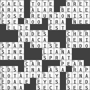 ACROSS 1. Highlander 5. Carry 9. Cy Young winner Saberhagen 13. Like ___ of sunshine 14. Having or resembling wings 15. Calif. Air Force Base 16. Introduce or present, as a question 17. One who advocates reunion 19. Compass dir. 20. Friend of Pooh 21. Retirement account (abbr.) 22. Born 23. Writer Wiesel 25. Eastern Standard Time (abbr.) 26. Unclothed pictures 30. "Mermaids" star 34. Phillipine bananalike plant 35. Painter Guido (1575-1642) 36. Connect, as a bridge 39. Annoying sound 42. Inside; within (prefix) 43. Trig term 44. Climbing, woody, usually tropical vines 46. Lacerate 47. Small fatty European fish 48. 4-wheeled motor vehicle 51. Lightbulb-shaped fruit 54. Music discs 57. _ tizzy (2 wds.) 58. White ___ sheet 60. Reproach for some lapse or misdeed 62. Rotating or pertaining to rotation 65. Inactive volcano in Sicily 66. Peak District village in England 67. Sight organs 68. Passed on 69. Pulitzer Prize-winning author Ferber 70. Religious group 71. Perceives with the eye DOWN 1. Stare wonderingly 2. Came up 3. Artist's stand 4. Sodium hydroxide 5. Edible starchy tuberous root 6. Butter sub 7. The 19th letter of the Greek alphabet 8. Bert's buddy 9. Benjamin's nick name 10. Precipitation 11. Otherwise 12. False hair 15. Water vessel 18. Big collection agency 20. Reuben's nickname 24. More empty; more void 27. Daniel's nick name 28. Environmental prefix 29. Travels by water 30. Cause to be 31. Layer 32. Conclusion 33. _ de Janeiro 36. Fast jet (abbr.) 37. Sliced dessert 38. Santa ___, CA 40. Small drink 41. Ewer handle 45. California wine valley 48. Quote 49. Cuckoo 50. All-night dance parties 52. Nick name for Arthur 53. The wife of a rajah (variant) 54. Algonquian 55. Texas town _ City 56. Comedian Laurel of Laurel & Hardy 58. Actor Baldwin 59. System (abbr.) 61. Writing tablets 63. Chicken ___ king 64. Sight organ 65. Begley and Asner