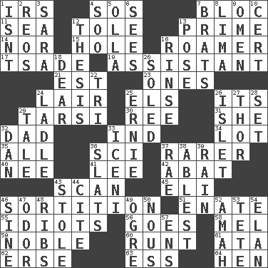 ACROSS 1. Big collection agency 4. Mayday 7. Alliance 11. Ocean 12. Lacquered or enameled metalware 13. First class 14. And not 15. Opening into or through something 16. Wanderer 17. Sadhe (variant) 19. Helper 21. Eastern Standard Time (abbr.) 23. Washington bills 24. Den 25. Raised railways 26. It is 29. Tarsus (plural) 30. To separate or throw off 31. A female animal or person 32. June honoree 33. Indiana (abbr.) 34. Car dealer's back yard 35. Everything 36. _-fi 37. More valued for its uncommonness 40. Born 41. Area sheltered from the wind 42. Blind as ____ 43. Glance over 45. Biblical high priest 46. Determination 51. Maternal 55. Foolish or stupid persons 56. Travels 58. Cartoonist voice _ Blanc 59. Impressive in appearance 60. The smallest animal of a litter 61. "One Day ___ Time" 62. Celtic language 63. Curvy letter 64. Layer DOWN 1. Is not 2. Vintage cars 3. "Two Mules for Sister ____" 4. "Barney Miller" actor Jack 5. Rounded earthenware pot or jar 6. Observes 7. Naughty children 8. Pale green bean 9. Sign of things to come 10. Sure thing 12. College paper 13. Airs 16. Remove soap 18. Letter starter 20. Having a sole or soles 22. Three (prefix) 24. Dipping utensil 25. Bert's buddy 26. Small island 27. Son of Odin 28. Put into a specified state 29. Story 32. Daniel's nick name 33. Ancient Celtic tribe of eastern Britain 36. Narrow boards 37. Actress Charlotte 38. Most capable 39. Water falling in drops from the sky 43. Took without asking 44. Quote 46. Trig term 47. Aroma 48. Teases 49. Legendary monster 50. Horse sense 52. Housemaid 53. Wig 54. Style 57. Followers of ems