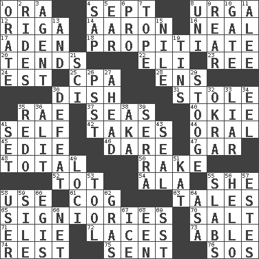 ACROSS 1. Mouth or opening 4. Back-to-school mo. 8. Capital and largest city of Mongolia 12. Capital of Latvia 14. Composer Copland 16. Actress Patricia 17. Arabian gulf 18. Conciliate 20. Watches over 22. Biblical high priest 23. To separate or throw off 24. Eastern Standard Time (abbr.) 25. Tax preparer (abbr.) 28. Followers of ems 30. Food container 31. Fur scarf 35. Actress Charlotte 37. Oceans 40. Migrant worker of the '30s 41. Itself 42. Proceeds 44. Spoken 45. Singer Brickell 46. Have the gumption 47. Slender fish 48. Add up to 50. Immoral or dissolute person 52. Small child 54. In the manner of 55. A female animal or person 58. Purpose 61. Gear tooth 63. Falsehoods 65. Seigniories (variant) 70. Table seasoning 71. Writer Wiesel 72. Shoestrings 73. Competent 74. State of inaction 75. Emitted 76. Distress signal DOWN 1. Speak pompously 2. Amusement-park features 3. Rep 4. Plant excrement 5. Hearing organ 6. Adept person 7. Drink excessively 8. University (slang) 9. Located in or toward the back 10. Yard entry 11. Toward shelter 13. Plus 15. The longest river in the world 19. Metal containers 21. _-fi 26. Inconspicuous attention getter 27. Forward in time 29. Moe Howard, for one 30. Outscore 32. Gumbo ingredient 33. One who doesn't tell the truth 34. Snakelike fish 35. Make new 36. Set down 38. Alias (abbr.) 39. Spanish missionary in California 41. Put into a specified state 43. Lick closed 49. Venues 51. Krazy ___ of comics 53. Instrument 55. Broad, flat, thick pieces 56. Phone greeting 57. _____ Park, CO 58. One who uses or employs something 59. Drop; flow; fall 60. Armor plate that protects the chest 62. Pate de foie ____ 64. White ___ sheet 66. Fish or hair follower 67. Frozen water 68. Car or cant ending 69. Fast jet (abbr.)