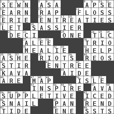 ACROSS 1. Stitched 5. White ___ sheet 8. Domed church section 12. Merit 13. Hit sharply and swiftly 14. Soft thread for cleaning between teeth 15. One of the Great Lakes 16. Pleas 19. Allow 20. More disrespectful 21. Tenth: prefix 23. Single 24. Affectionate concern, for short 27. Toward shelter 30. Musical group of three 31. Ear of corn 34. Assist 35. American tennis player Robert 38. Disturbances 40. Vintage cars 41. Use a swizzle stick 42. Main course 44. Polynesian shrub of the pepper family 45. Assistant 46. "We ___ not amused" (Victoria) 47. Atlas unit 50. Capri or Wight 53. Motivate 57. Actress Gardner 59. Supplying deficiencies 63. On the rocks 64. Slow-paced one 65. Baking dish 66. Tear apart 67. Event that recurs at intervals 68. Compass dir. 69. Fast planes DOWN 1. Sew up the eyelids of hawks and falcons 2. Having ears or earlike features 3. Compose 4. Compass dir. 5. Length times width 6. Without 7. Tenement units (abbr.) 8. The first octave above the treble staff 9. Luau course 10. Compass dir. 11. Double-curved letter 14. Conductor's collection 17. _ de Janeiro 18. Car or cant ending 20. Filth; sediment 22. Device for capturing images 24. Woody plant 25. _ and Stitch 26. 911 reaches them 28. Ewer handle 29. Writer Wiesel 30. Trios 32. Electrically charged atom 33. Singer James 35. "____ silly question..." 36. Play the lead 37. Hub of activity 39. _ Lanka 43. Singer Brickell 47. Place where flour is made 48. One (Scot) 49. Pacific Standard Time (abbr.) 51. Shoestrings 52. Incident 54. Corncob 55. _ the terrible 56. French philosopher Descartes 58. Sums up 59. Fast jet (abbr.) 60. Corn or form start 61. Writing tablet 62. Sliced dessert 63. Big collection agency