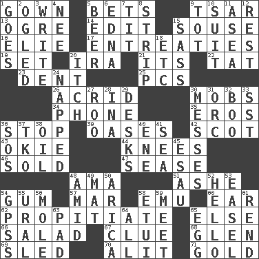 ACROSS 1. Bride's dress 5. Wagers 9. Russian ruler of old 13. Legendary monster 14. Prepare for publication 15. Lush 16. Writer Wiesel 17. Pleas 19. Put into a specified state 20. Lyricist Gershwin 21. ___ a Wonderful Life 22. Make lace 23. Undesirable depression on a surface 25. Personal Computers (abbr.) 26. Sour-tasting 30. Disorderly crowds 34. Give a jingle 35. Greek god of love 36. Cease 39. Fertile tracts in a desert 42. Highlander 43. Migrant worker of the '30s 44. Leg joints 46. Disposed of to a purchaser 47. Gospel singer Marvin 48. Wet nurse (var.) 51. American tennis player Robert 54. Chewing product 57. Impair 58. Australian flightless bird 60. Hearing organ 62. Appease 65. Otherwise 66. Vegetable dish 67. A slight indication 68. Small, secluded valley 69. Downhill vehicle 70. Came down and settled, as after flight 71. Precious metal DOWN 1. Travels 2. Stared at amorously 3. Compose 4. Born 5. Fermented drink made from hops 6. Pulitzer Prize-winning author Ferber 7. Teat (slang) 8. Long narrow piece of something 9. Small child 10. Set or collection 11. Toward the sea 12. Respite 15. Backtalk 18. And so on (abbr.) 20. Hankering 24. Slept 27. Friend of Pooh 28. _ tizzy (2 wds.) 29. Writing tables 30. Makes clutter 31. The grampus (Milton) 32. Oct. 31 cry 33. Fast jet (abbr.) 36. Distress signal 37. Ring climax 38. Petroleum 40. Compass dir. 41. Ocean 45. He sold his birthright 48. Among 49. Floor protector 50. N. Chile seaport 52. Phone greeting 53. Artist's stand 54. Global Positioning Systems (abbr.) 55. Mountain range 56. Undercover agent 58. Needle holder 59. Rendezvous 61. Tear apart 63. Writing tablet 64. 100% 65. Oval reproductive body of a fowl