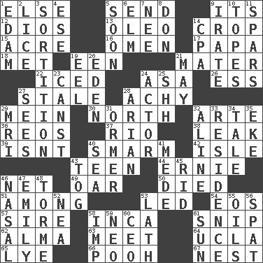 ACROSS 1. Otherwise 5. Transmit 9. ___ a Wonderful Life 12. "Vaya con ____" 13. Butter sub 14. Riding implement 15. Measure of real estate 16. Sign of things to come 17. Dad 18. Was introduced to 19. Car or cant ending 21. Mother 22. On the rocks 24. White ___ sheet 26. Double-curved letter 27. Lacking originality or spontaneity 28. Painful 29. Chow _ 30. 0 degrees 32. Johnson of "Laugh-In" 36. Vintage cars 37. _ de Janeiro 38. Path through which fluid escapes 39. Is not 40. Excessive but superficial compliments 42. Capri or Wight 43. Adolescent 44. Bert's buddy 46. Remaining after all deductions 49. Boat paddle 50. Passed on 51. Amid 53. Directed 54. Greek goddess of the dawn 57. Father 58. South American Indian 61. Sever or remove by pinching or nipping 62. _ mater 63. Rendezvous 64. Southern CA. univ. 65. Sodium hydroxide 66. "Silly old bear" 67. A home for chicks DOWN 1. Dutch treat 2. Louse (plural) 3. Casting lots 4. Compass dir. 5. Within a short period 6. Shade tree 7. Born 8. Spanish title 9. Feeling or showing extreme anger 10. Drinks excessively 11. Practice fights 14. Accounting whiz (abbr.) 19. Snakelike fish 20. Genesis locale 21. Fifth month 23. 2nd pers. sing. pres. of can (arch.) 24. Thespian 25. Quiet! 27. Perceives with the eye 28. Believer in; advocate of (suffix) 29. Medical imaging device (abbr.) 31. Channel Islands abalone 32. Place in a line 33. Home 34. Story 35. Supplement with great effort 40. Ocean 41. Ancient Persian 43. Coat; cloak 45. To free from 46. Relating to the nose 47. Poet Dickinson 48. Singer Mel 52. Teachers' org. 53. Thin strip of wood or metal 55. Petroleums 56. Petty quarrel 58. Mischievous child 59. Modern: prefix 60. Corporate head (abbr.) 61. Player for Phoenix