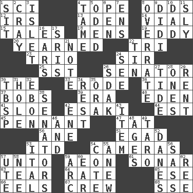 ACROSS 1. _-fi 4. Drink excessively 8. Likelihood 12. Big collection agency 13. Arabian gulf 14. Small bottle 15. Falsehoods 18. Not women's 19. Whirlpool 20. Felt deep pity or tenderness 22. Three (prefix) 23. Musical group of three 24. Title for a knight 25. Fast jet (abbr.) 26. Elected representative 30. Definite Article 33. Eat (away) 36. Prong on a fork 37. Moves up and down 39. Period 40. Genesis locale 41. A type of plum 42. 1973 Nobel Price Winner (Physics) Leo 44. Eastern Standard Time (abbr.) 45. Pre-World Series prize 47. Make lace 50. A saturated hydrocarbon 51. Mild oath 53. It would 54. Devices for capturing images 57. To (old English) 59. Period of immesurable duration 61. Underwater navigation system 63. Separate forcefully 64. Assign a rank or rating to 65. Compass dir. 66. Snakelike fish 67. Group working together 68. Compass dir. DOWN 1. Be seated 2. Supercomputer manufacturer 3. Small island 4. Docile 5. Wrote a lyric poem 6. Writing instrument 7. Followers of ems 8. Make much ado about nothing 9. "You Light Up My Life" star Conn 10. June honoree 11. Playfully artful 16. Hearing organs 17. Indian titles of respect 21. Brief written record 22. Shallow baking pan 24. Perceive with the eye 26. Neighbor of Neb. 27. Periodic rise and fall of the sea level 28. Singles 29. Monthly bill 30. Cook's measure (abbr.) 31. Opening into or through something 32. Inky black, to poets 34. Take ten 35. Mouth or opening 38. Legislators 42. Compass dir. 43. A distinct part 46. Also 48. Ripens 49. Edible starchy tuberous root 52. Natives or inhabitants of Denmark 53. Slanted text style (abbr.) 54. ____ d'Azur (French Riviera) 55. Afresh 56. Backtalk 57. Shoshoni 58. Born 59. Curve 60. Hearing organ 62. To sift
