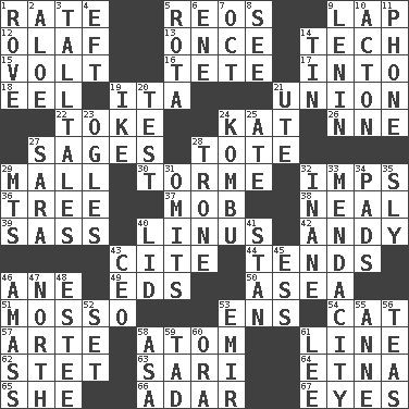 ACROSS 1. Assign a rank or rating to 5. Vintage cars 9. Infant locale 12. Norwegian king 13. Single time 14. Technician 15. Electrical Unit 16. False hair 17. To the inside or interior of 18. Snakelike fish 19. Call ___ day 21. The state of being joined or united 22. Casino tip 24. Krazy ___ of comics 26. Compass dir. 27. Gurus 28. Haul 29. Promenade 30. Singer Mel 32. Naughty children 36. Woody plant 37. Crowd into 38. Anneal 39. Backtalk 40. "_ and Lucy" (Charlie Brown theme song) 42. Actor Griffith 43. Quote 44. Is inclined (to) 46. One (Scot) 49. Begley and Asner 50. Toward the sea 51. With motion or animation 53. Followers of ems 54. Domesticated feline 57. Johnson of "Laugh-In" 58. Smallest unit of an element 61. Actor's bit 62. Proofreading order 63. Indian skirt 64. Inactive volcano in Sicily 65. A female animal or person 66. The sixth month of the Jewish calendar 67. Snake ____ (dice throw) DOWN 1. Be footloose 2. Medicinal plant 3. Baron Munchausen's specialties 4. Bank Draft (abbr.) 5. Round or rotation of duties 6. Compass dir. 7. Sep. follower 8. Observe 9. Soviet premier 1918-24 10. Gambison 11. Give a jingle 14. Shallow baking pan 19. Mamie's mate 20. Trial 21. Shoshoni 23. Stares 24. Dried seaweed eaten as food 25. Had dinner 27. "Two Mules for Sister ____" 28. Marketplace scale 29. Mountains (abbr.) 31. Leaves out 32. Silly 33. Ananias' fault 34. Writing tablets 35. Playfully artful 40. Hat (slang) 41. Comedian Laurel of Laurel & Hardy 43. Corporate head (abbr.) 45. Curvy letter 46. Collect or gather 47. Compass direction 48. First name in cosmetics 52. Put into a specified state 53. Arab leader 55. Queen of England 1702-14 56. Afternoon social gatherings 58. White ___ sheet 59. Small amount or degree 60. Mouth or opening 61. Area sheltered from the wind