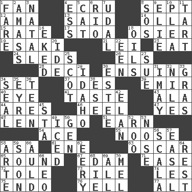 ACROSS 1. Avid follower 4. Shade of tan 8. Back-to-school mo. 12. Housemaid (var.) 13. Stated 14. Spanish pot 15. Assign a rank or rating to 17. Portico 18. Flexible twig of a willow tree 19. 1973 Nobel Price Winner (Physics) Leo 21. Flowery wreath 23. Consume 24. Bobsleighs 26. Raised railways 28. Tenth: prefix 30. Following as a consequence or result 34. Arrange properly for use 37. Lyric poems 39. Arab leader 40. Sight organ 41. Clothes sense 43. According to 44. Ancient Greek god of war 46. The bottom of a shoe or boot 47. Consenting reply 48. Small, flat, pigmented spot on the skin 51. Merit 54. Adept person 55. Trap for birds or small mammals 58. White ___ sheet 61. Compass dir. 63. Motion picture award 65. Single shot of ammunition 67. Dutch treat 71. Comfort 72. Lacquered or enameled metalware 73. Cause heat under the collar 74. French article 75. Inside; within (prefix) 76. Shout 77. Keyboard modifier key DOWN 1. Conductor's collection 2. Collect or gather 3. Relating to or accompanying birth 4. Curvy letter 5. Feline 6. _ de Janeiro 7. Allodial 8. Mayday 9. Writer Wiesel 10. Entreaty 11. Small pie 16. Made supply last 18. Lubricates 20. Binary compound 22. Car or cant ending 25. Native of Scotland 27. Take to court 29. Potato state 30. First name in cosmetics 31. "If ____ say so..." 32. "Death on the ____" 33. Pate de foie ____ 34. Lick closed 35. Jane of fiction 36. Adolescent 38. Compass dir. 42. Liveliness 45. R.R. building 49. On the rocks 50. Commissioned mil. rank 52. Friend of Pooh 53. Sense of smell 56. Any of the three canals of the cochlea 57. Artist's stand 58. Johnson of "Laugh-In" 59. Within a short period 60. Old (Scot.) 62. Suggestive of the supernatural 64. Relief 66. Modern: prefix 68. Expire 69. 100% 70. Cartoonist voice _ Blanc