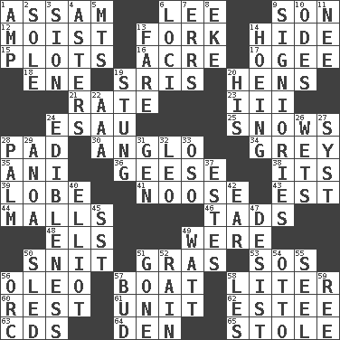 ACROSS 1. Indian state 6. Area sheltered from the wind 9. Boy, to dad 12. Wet 13. Tined utensil 14. Flintstone garb 15. Ground plans 16. 43,560 square feet 17. Double curve, resembling the letter S 18. Compass dir. 19. Indian titles of respect 20. Coop moms 21. Assign a rank or rating to 23. One more than two 24. He sold his birthright 25. Overwhelms 28. Writing tablet 30. White American of non-Hispanic descent 34. Jennifer or Joel 35. Cuckoo 36. Honkers 38. ___ a Wonderful Life 39. Ear part 41. Trap for birds or small mammals 43. Eastern Standard Time (abbr.) 44. Promenades 46. Bits 48. Raised railways 49. We are 50. In a ____ (agitated or irritated) 51. Pate de foie ____ 53. Mayday 56. Butter sub 57. Water vessel 58. 61 cubic inches 60. Respite 61. A single undivided whole 62. First name in cosmetics 63. Music discs 64. Lair 65. Fur scarf DOWN 1. Electrical Unit 2. Flatfish 3. The Jewish people; Israel 4. Michaelmas daisies 5. Mountains (abbr.) 6. Locales 7. Blunders 8. Make supply last 9. Seigniories (variant) 10. Lyric poems 11. Born 13. Conductor's collection 14. Cultivating 19. Feeling sharp psychological pain 20. Part of HMS, perhaps 22. Auto club (abbr.) 24. The property of being fit to eat 26. Moistens 27. System (abbr.) 28. Inside of hand 29. Small Philippine buffalo 31. Commissioned military rank (abbr.) 32. Lion 33. Bear (Spanish) 37. _____ Park, CO 40. American author Paul (1891-1958) 42. Hearing organ 45. Fast jet (abbr.) 47. Cease 49. Electrical Unit 50. Downhill vehicle 51. Went 52. Water falling in drops from the sky 54. Von Bismarck 55. Stitch closed the eyes of (a falcon) 56. The grampus (Milton) 57. Partially opened flower 58. French article 59. To riddle
