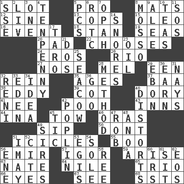 ACROSS 1. Notch 5. Adept person 8. Floor coverings 12. Trig term 13. 911 reaches them 15. Butter sub 16. Incident 18. Comedian Laurel of Laurel & Hardy 19. Oceans 20. Writing tablet 22. Opts 24. Greek god of love 26. River (Sp.) 27. Olfactory organ 28. Cartoonist voice _ Blanc 29. Car or cant ending 32. It's straight from the horse's mouth 35. Eons 37. Sound made by sheep 38. Whirlpool 39. Small bed 40. Small, narrow, flatbottom fishing boat 41. Born 42. "Silly old bear" 43. Taverns 44. _ tizzy (2 wds.) 45. Pull behind 46. Mouths or openings 49. Small drink 50. Do not 51. Winter's stalactites 55. Sometimes accompanies a hiss 56. Independent ruler or chieftain 57. Composer Stravinsky 59. Ascend 63. Nathan's nickname 64. Mediterranean tributary 65. Musical group of three 66. Sight organs 67. Perceive with the eye 68. Fast planes DOWN 1. Compass dir. 2. 54 in ancient Rome 3. Single 4. 3-inch nail 5. Personal Computers (abbr.) 6. College mil. group 7. Brightly colored fish 8. With motion or animation 9. Toward shelter 10. Afternoon social gatherings 11. Mayday 14. Sounds asleep 17. Pacific island yam 21. Two (Sp.) 23. Lubricate 25. Manatee 28. Mode 29. Inky black, to poets 30. Merit 31. Negative votes 32. Painter Guido (1575-1642) 33. Locale of original sin 34. It may be bright or harebrained 36. Thick or sticky substance 40. What propaganda does 42. Cotton for raincoats, e.g. 45. Nervous spasm 47. Director Reiner 48. Small Philippine buffalo 49. Male parents of animals 51. "If ____ say so..." 52. Quote 53. Armor plate that protects the chest 54. Flatfish 56. Compass dir. 58. To riddle 60. Big collection agency 61. Be seated 62. Greek goddess of the dawn