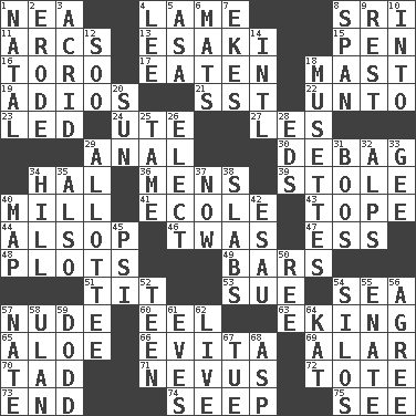 ACROSS 1. Teachers' org. 4. Unable to walk 8. Indian title of respect (Mr.) 11. Arches 13. 1973 Nobel Price Winner (Physics) Leo 15. Writing instrument 16. "Corrida" creature 17. Eroded 18. Vertical spar for supporting sails 19. Goodbye (Sp.) 21. Fast jet (abbr.) 22. To (old English) 23. Directed 24. Shoshoni 27. French article 29. Of or related to the anus 30. Debunk (Brit. slang) 34. Actor Linden 36. Not women's 39. Took without asking 40. Place where flour is made 41. Learning spot: Fr. 43. Drink excessively 44. Columnist Joseph or Stewart 46. It was, poetically 47. Double-curved letter 48. Ground plans 49. Drinking establishments 51. Teat (slang) 53. Take to court 54. Ocean 57. Naked 60. Snakelike fish 63. Supplementing with great effort 65. Medicinal plant 66. Webber/Rice musical 69. Having or resembling wings 70. Small boy 71. Congenital growth or mark on the skin 72. Haul 73. Conclude 74. Ooze 75. Perceive with the eye DOWN 1. Brizilian seaport 2. Eat (away) 3. Sour-tasting 4. Area sheltered from the wind 5. White ___ sheet 6. Floor coverings 7. Supplements with great effort 8. Connect, as a bridge 9. Repose 10. To the inside or interior of 12. "Barney Miller" actor Jack 14. International (abbr.) 18. French bagpipes 20. Player for Phoenix 25. Docile 26. Voters do this 28. Begley and Asner 29. One to whom something is allotted 31. Scornful sounds 32. High mountains 33. Unit of force equal to gravity 34. Land elevation 35. In addition 37. At this time 38. Broad, flat, thick pieces 40. Atlas unit 42. He sold his birthright 45. Air pressure measure (abbr.) 50. Portuguese money of account (variant) 52. Adolescent 54. Grain storage towers 55. Related on the mother's side 56. Match 57. Nathan's nickname 58. ____ Bator, Mongolia 59. Texas town _ City 61. Nights before holidays 62. Moving, as bait 64. Krazy ___ of comics 67. Third day of the wk. 68. Cleo's killer