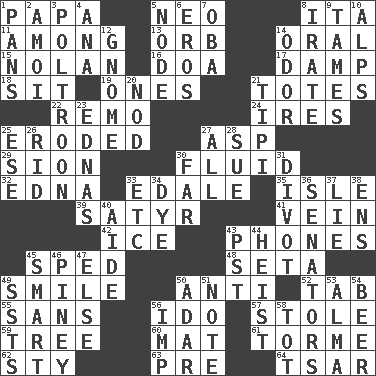 ACROSS 1. Dad 5. Modern: prefix 8. Call ___ day 11. Amid 13. Globe 14. Of the mouth 15. Pitcher Ryan 16. ___ good deed 17. Moist 18. Be seated 19. Washington bills 21. Hauls 22. San ____ (Riviera town) 24. Angers 25. Worn away 27. Cleo's killer 29. The Jewish people; Israel 30. Watery 32. Pulitzer Prize-winning author Ferber 33. Peak District village in England 35. Capri or Wight 39. Letch 41. Distinctive style or manner 42. Frozen water 43. Gives a jingle 45. Hurried 48. Bristle 49. Grin 50. Against 52. Keyboard key 55. Without 56. Wedding promise 57. Took without asking 59. Relationship diagram 60. Floor protector 61. Singer Mel 62. Filthy place 63. Before (prefix) 64. Russian ruler of old DOWN 1. Baking dishes 2. Mine, in Marseilles 3. Coward 4. Santa ___, CA 5. Thickened enlargement 6. Greek god of love 7. Chief or king in Benin or Nigeria 8. Feeling or showing extreme anger 9. Makes less strong or intense 10. High mountains 12. Dwarf 14. Scent 20. Lower and raise head in agreement 21. Native american tent (variation) 23. Ferber et al. 25. Compass dir. 26. To free from 27. Everything 28. Take to court 30. At a great distance 31. A piece of turf (Scot.) 33. And so on (abbr.) 34. Color 36. Elected representatives 37. Whopper 38. Followers of ems 40. Assistant 43. Pacific Standard Time (abbr.) 44. Robbery 45. Don Adams' spy role 46. Abounding in pines 47. Otherwise 49. Fast planes 50. The sixth month of the Jewish calendar 51. Observe 53. _ mater 54. Fermented drink made from hops 56. Naughty child 58. Small child