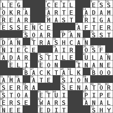 ACROSS 1. Part of a journey 4. To provide with a ceiling 8. Curvy letter 11. Gumbo ingredient 13. Johnson of "Laugh-In" 14. First man 15. Bring up, as a child 16. Vertical spar for supporting sails 17. Port city in Latvia 18. Substance 21. Following 22. Fly high 23. Baking dish 25. Fast jet (abbr.) 26. One of the 12 tribes of Israel 29. File 13 32. Sibling's daughter 34. Wind 35. Order of Saint Francis (abbr.) 38. The sixth month of the Jewish calendar 39. Vertical member of a panel or frame 41. Uhlan (variant) 43. Connecticut Ivy Leaguer 44. A really long time 45. Lacking in sense or substance 46. Sass 50. Surprise greeting 51. Wet nurse (var.) 54. Had dinner 55. The Jewish people; Israel 57. Father Junipero _ 59. Legislator 63. Portico 64. Needle case 67. Corncob 68. Celtic language 69. Armed conflicts 70. Of or related to the anus 71. Born 72. Prepare for publication 73. Like a shrinking violet DOWN 1. Old wives' tales, e.g. 2. Supplements with great effort 3. Pate de foie ____ 4. Device for capturing images 5. Period 6. It is 7. Allow 8. Prepares for publication 9. Gurus 10. Don Adams' spy role 12. Ancient Greek god of war 14. Sandy's bark 19. Brief written record 20. Auto 21. Santa ___, CA 23. Silvers or Donahue 24. 1/640 square mile 26. Heredity factor (abbr.) 27. Helper 28. Actress Patricia 30. Virtuous person 31. Part of speech 33. Baby bed with high sides 36. Thick slice 37. Papal veil 39. Religious group 40. Casino tip 42. Modern: prefix 45. Image 47. American Automobile Association (abbr.) 48. Help 49. Falsehood 51. NE Netherlands city 52. Distance measurement (Brit.) 53. Came up 56. California wine valley 58. Actress Charlotte 60. Canisters 61. Brightly colored fish 62. Have trust in 64. She-sheep 65. Small boy 66. RI univ.
