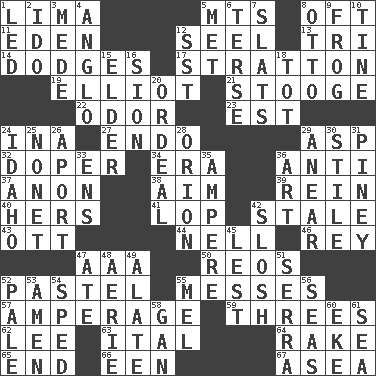 ACROSS 1. Pale green bean 5. Mountains (abbr.) 8. Often (poetically) 11. Locale of original sin 12. Sew up the eyelids of hawks and falcons 13. Three (prefix) 14. Evades 17. Ski resort town in Vermont 19. American author Paul (1891-1958) 21. Moe Howard, for one 22. Aroma 23. Eastern Standard Time (abbr.) 24. _ tizzy (2 wds.) 27. Inside; within (prefix) 29. Cleo's killer 32. Drug addict 34. Epoch 36. Opposed to 37. Soon (poet.) 38. Direct toward a target or goal 39. It's straight from the horse's mouth 40. Possessive pronoun 41. Chop off 42. Lacking originality or spontaneity 43. Baseball player Mel 44. 1994 drama film starring Jodie Foster 46. Marina Del _, California 47. Auto club (abbr.) 50. Vintage cars 52. Soft color 55. Makes clutter 57. Electrical Measurement 59. Triplets 62. Area sheltered from the wind 63. Slanted text style (abbr.) 64. Immoral or dissolute person 65. Conclude 66. Car or cant ending 67. At sea DOWN 1. Directed 2. Wedding promise 3. Ancient Persian 4. White American of non-Hispanic descent 5. Was introduced to 6. Laconic 7. Narrow boards 8. Von Bismarck 9. Toadlike animal 10. Prong on a fork 12. Fast jet (abbr.) 15. A person who is older than you are 16. The Jewish people; Israel 18. Small child 20. Severe or trying experience 24. Potato state 25. Music written for nine 26. To the left, to Queeg 28. Constellation of myth 29. Approach 30. Vertical member of a panel or frame 31. Abounding in pines 33. Followers of ems 35. Electrical Unit 36. Nonscientific branch of learning 42. Make a splashing sound 45. For fear that 47. Had dinner 48. Nest on high 49. Having winglike extensions 51. Spanish missionary in California 52. Diluted with white 53. So be it 54. Moved rapidly 55. Cartoonist voice _ Blanc 56. Oceans 58. Separate the seeds from cotton 60. Make supply last 61. Ocean