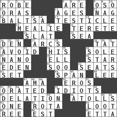 ACROSS 1. Loose flowing garment 5. "We ___ not amused" (Victoria) 8. Bear (Spanish) 11. Mouths or openings 12. Eras 13. Tired old horse 14. Greek mezzo-soprano Agnes 17. A testis 19. Ear of corn 21. Cylindrical with tapered ends 22. Narrow board 23. Ocean 24. Lair 27. Arches 29. Make lace 32. Shun 34. Part of HMS, perhaps 36. Not divided or shared with others 37. Billionth: prefix 38. Pipe bend 39. Play the lead 40. Genesis locale 41. "Barney Miller" actor Jack 42. Theater features 43. Put into a specified state 44. Connect, as a bridge 46. Area sheltered from the wind 47. Housemaid (var.) 50. Greek god of love 52. Declaimed 55. Foolish or stupid persons 57. Conveyance 59. Ringlike coral islands and reefs 62. Single 63. Roll call or roster of names 64. Plunder 65. Portuguese money of account (variant) 66. Eastern Standard Time (abbr.) 67. Singer James DOWN 1. Director Reiner 2. Mouth or opening 3. Lip ointment 4. _____ Park, CO 5. Mature 6. Musical pauses 7. First name in cosmetics 8. At one time in the past 9. Table seasoning 10. Double curve, resembling the letter S 12. Had dinner 15. First course 16. Having or resembling wings 18. Retirement account (abbr.) 20. Strong, restless desires 24. Natives or inhabitants of Denmark 25. Dodge 26. Music written for nine 28. Grain storage towers 29. Add up to 30. Having winglike extensions 31. Laconic 33. Electrically charged atom 35. Had an oblique or slanted direction 36. Compass dir. 42. Snob 45. Operatic vocal solo 47. "One Day ___ Time" 48. Distance measurement (Brit.) 49. Goodbye (Sp.) 51. Fur scarf 52. Scent 53. French philosopher Descartes 54. Toward shelter 55. _ tizzy (2 wds.) 56. Notch 58. Baseball player Mel 60. Car dealer's back yard 61. R.R. building