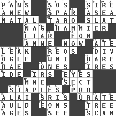 ACROSS 1. Zero-star reviews 5. Distress signal 8. Male parent of an animal 12. Afresh 13. Practice fight 15. At sea 16. Brizilian seaport 18. Edible starchy tuberous root 19. Narrow board 20. Tired old horse 22. More given to overacting 24. One who doesn't tell the truth 26. Period of immesurable duration 27. Queen of England 1702-14 28. At this time 29. Had dinner 32. Path through which fluid escapes 35. Vintage cars 37. HTML Container Element 38. Stare at amorously 39. University (slang) 40. Have the gumption 41. Actress Charlotte 42. Singles 43. Angers 44. Binary compound 45. Big collection agency 46. Sight organs 49. Madame (abbr.) 50. Religious group 51. Paper fasteners 55. Adept person 56. Mountain range southwest of Kyrgyzstan 57. Indian titles of respect 59. A salt of uric acid 63. Old (Scot.) 64. Immeasurably long periods of time 65. Woody plant 66. Eons 67. Observe 68. Glance over DOWN 1. Baking dish 2. Santa ___, CA 3. Fish or hair follower 4. Tchaikovsky ballet 5. Fast jet (abbr.) 6. Brightly colored fish 7. "Two Mules for Sister ____" 8. Indian antelope 9. Capri or Wight 10. Stern 11. Consume 14. Lover boys 17. (Had) reclined 21. Separate the seeds from cotton 23. Cut the grass 25. Summer TV shows 28. Annoying sounds 29. The sixth month of the Jewish calendar 30. Hoop that covers a wheel 31. Nights before holidays 32. Australian parrot (variant) 33. Mild oath 34. Toward shelter 36. Compass dir. 40. What propaganda does 42. Threatening words 45. Naughty child 47. Slangy assent 48. Shade of tan 49. Women servants 51. A hard, heavy blow 52. Story 53. Greek god of love 54. Trig term 56. Auto club (abbr.) 58. Compass dir. 60. Curve 61. Beverage made from leaves 62. Car or cant ending