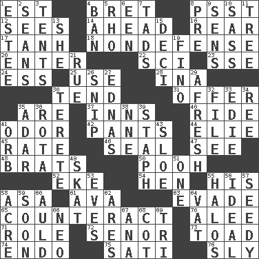 ACROSS 1. Eastern Standard Time (abbr.) 4. Cy Young winner Saberhagen 8. Inconspicuous attention getter 12. Perceives with the eye 14. Toward the future 16. Posterior 17. Hyperbolic tangent 18. Unrelated to defense, as in spending 20. Keyboard key 22. _-fi 23. Compass dir. 24. Double-curved letter 25. Purpose 28. _ tizzy (2 wds.) 30. Be inclined (to) 31. Auction bid 35. "We ___ not amused" (Victoria) 37. Restaurants 40. Travel on an animal 41. Scent 42. Leg coverings 44. Writer Wiesel 45. Assign a rank or rating to 46. Lick closed 47. Observe 48. Naughty children 50. "Silly old bear" 52. Make supply last 54. Layer 55. Part of HMS, perhaps 58. White ___ sheet 61. Actress Gardner 63. Dodge 65. Act in opposition 70. Toward shelter 71. Hero or heavy, e.g. 72. Sir (Sp.) 73. Frog relative 74. Inside; within (prefix) 75. Suttee (variant) 76. Wily DOWN 1. First name in cosmetics 2. Actors Connery and Penn 3. Portable shelters 4. Bar 5. 17th letter of the Greek alphabet 6. Car or cant ending 7. Small amounts or degrees 8. Before (prefix) 9. Elected reps. 10. Backtalk 11. Family _ (genealogy) 13. A female animal or person 15. Tenth: prefix 19. Fine (Spanish) 21. Regret 26. Sever or remove by pinching or nipping 27. Ferber et al. 29. Anew 30. Cigar-shaped 32. Do some clerical work 33. Singer Brickell 34. To sift 35. The sixth month of the Jewish calendar 36. Round or rotation of duties 38. Compass dir. 39. Staphylococcus 41. Globe 43. _ gin 49. Three-handed card game 51. Single 53. Nights before holidays 55. Radiant circles of light 56. Perfect 57. Morally degraded 58. 43,560 square feet 59. Within a short period 60. Old (Scot.) 62. Ancient Greek god of war 64. Large container 66. Modern: prefix 67. Santa ___, CA 68. Small bed 69. Three (prefix)