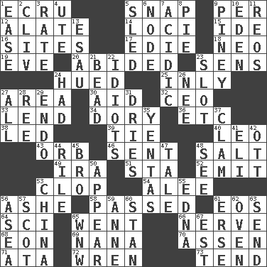 ACROSS 1. Shade of tan 5. Fastener 9. For each 12. Having winglike extensions 14. Locales 15. Binary compound 16. Locates 17. Singer Brickell 18. Modern: prefix 19. Night before a holiday 20. Tolerated 23. Elected reps. 24. Took on color 25. In an inward manner 27. Length times width 30. Help 32. Corporate head (abbr.) 33. Grant temporary use of 34. Rowboat 36. And so on (abbr.) 38. Directed 39. Make a knot 40. Lion 43. Globe 46. Transmitted 48. Table seasoning 49. Retirement account (abbr.) 51. R.R. building 52. Send forth 53. Hoof sound 54. Toward shelter 56. American tennis player Robert 58. Went by 61. Greek goddess of the dawn 64. _-fi 65. Left 66. Effrontery 68. Period of immesurable duration 69. Nanny 70. NE Netherlands city 71. _ moment's notice (2 wds.) 72. Songbird 73. Be inclined (to) DOWN 1. Relaxation 2. 154 in Roman numerals 3. Assign a rank or rating to 4. Shoshoni 5. Downhill vehicle 6. Connecting point 7. Being or containing an acid 8. Sliced dessert 9. Abounding in pines 10. Paradise 11. Vintage cars 13. He sold his birthright 21. Necklace unit 22. Foolish or stupid persons 23. Groove 24. Possessed 26. Born 27. Everything 28. To riddle 29. Inside; within (prefix) 31. Frees from moisture 35. Gossips 37. Burrowing marine mollusk 41. Biblical high priest 42. Baseball player Mel 44. Cause heat under the collar 45. Sis' sibling 47. Story 48. Perceive with the eye 50. Become visible 53. Large country 55. Pulitzer Prize-winning author Ferber 56. Toward the sea 57. Highlander 59. Queen of England 1702-14 60. Comedian Laurel of Laurel & Hardy 61. Celtic language 62. Baking chamber 63. Post 65. Compass dir. 67. Eastern Standard Time (abbr.)