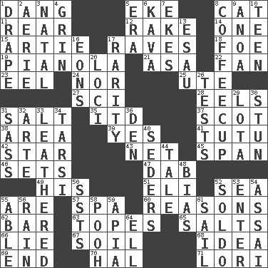 ACROSS 1. Mild oath, euphamism for damn 5. Make supply last 8. Domesticated feline 11. Tail end 12. Immoral or dissolute person 14. Single 15. Nick name for Arthur 17. All-night dance parties 18. Enemy 19. Player piano 21. White ___ sheet 22. Air blower 23. Snakelike fish 24. Not either 25. Shoshoni 27. _-fi 28. Snakelike fish 31. Table seasoning 35. It would 37. Native of Scotland 38. Length times width 39. Affirmative reply 41. Ballerina skirt 42. Play the lead 43. Fish or hair follower 45. Connect, as a bridge 46. Arranges properly for use 47. Small moist lump or mass 49. Part of HMS, perhaps 51. Biblical high priest 52. Ocean 55. "We ___ not amused" (Victoria) 57. Health resort 60. Thinks logically 62. Oblong piece of solid material 63. Drinks excessively 65. Table seasonings 66. Untruth 67. Land 68. The main thing one is thinking about 69. Conclusion 70. Actor Linden 71. Australian parrot (variant) DOWN 1. Window treatment 2. Nest on high 3. Brizilian seaport 4. Smile widely 5. Epoch 6. Polynesian shrub of the pepper family 7. Supplements with great effort 8. Java holder (2 wds.) 9. Small Philippine buffalo 10. Adolescent 13. He sold his birthright 16. Immeasurably long periods of time 17. Noteworthy scarcity 20. Venues 26. Trials 29. Globular water bottle used in Asia 30. Astound 31. Backtalk 32. Johnson of "Laugh-In" 33. Resembling or made to resemble leather 34. Tarsus (plural) 36. Lair 40. Spring feasts 44. Lie 48. Prejudice 50. Fast planes 52. Twentieth part of a lira 53. Keyboard key 54. Slender Brazilian palm 55. Competent 56. Water falling in drops from the sky 58. "Silly old bear" 59. Capital of Western Samoa 61. Travel by water 64. Pipe bend