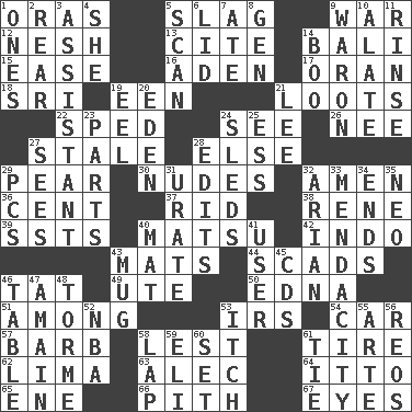 ACROSS 1. Mouths or openings 5. Volcanic refuse 9. Armed conflict 12. Delicate 13. Quote 14. Indonesian resort city 15. Relaxation 16. Arabian gulf 17. NW Algerian seaport 18. Indian title of respect (Mr.) 19. Car or cant ending 21. Plunders 22. Hurried 24. Perceive with the eye 26. Born 27. Showing deterioration from age 28. Otherwise 29. Lightbulb-shaped fruit 30. Unclothed pictures 32. So be it 36. Penny 37. To free from 38. French philosopher Descartes 39. Fast planes 40. Taiwanese island in East China Sea 42. _ china 43. Floor coverings 44. Oodles 46. Make lace 49. Shoshoni 50. Pulitzer Prize-winning author Ferber 51. Amid 53. Big collection agency 54. 4-wheeled motor vehicle 57. Sharp remark 58. For fear that 61. Become fatigued 62. Pale green bean 63. Actor Baldwin 64. "Tell ____ the Marines!" 65. Compass dir. 66. Heart or essence 67. Sight organs DOWN 1. Singles 2. Hitchcock's "____ Window" 3. Helper 4. A female animal or person 5. Skim 6. Hat (slang) 7. Had dinner 8. Commissioned mil. rank 9. Make _____ (do battle with) 10. Having winglike extensions 11. Wash lightly 14. Sometimes accompanies a hiss 19. Snakelike fish 20. Genesis locale 21. Area sheltered from the wind 23. Pieces 24. Bobsleighs 25. Curvy letter 27. Perceives with the eye 28. Prepares for publication 29. Personal Computers (abbr.) 31. A salt of uric acid 32. Believer in; advocate of (suffix) 33. Ananias' fault 34. Conclusions 35. Modern: prefix 40. Floor covering 41. One who uses or employs something 43. Java container 45. Music discs 46. Eating place 47. At full speed 48. Singer Mel 52. Basketball assoc. 53. Hankering 55. Johnson of "Laugh-In" 56. Vintage cars 58. Infant locale 59. Connecticut Ivy Leaguer 60. Arrange properly for use 61. Make a knot