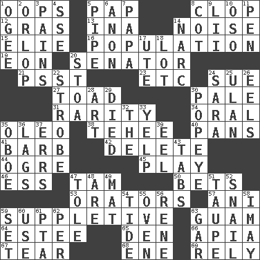 ACROSS 1. I made a mistake 5. Infant food 8. Hoof sound 12. Pate de foie ____ 13. _ tizzy (2 wds.) 14. Annoying sound 15. Writer Wiesel 16. Census information 19. A really long time 20. Elected representative 21. Inconspicuous attention getter 23. And so on (abbr.) 24. Institute legal proceedings 27. Frog relative 30. Diluted with white 31. Noteworthy scarcity 34. Spoken 35. Butter sub 38. Giggle 40. Zero-star reviews 41. Sharp remark 42. Keyboard key 44. Legendary monster 45. Frolic 46. Curvy letter 47. Scottish cap 50. Wagers 53. Speakers 57. Cuckoo 59. Supplementary 63. Island territory of the United States 64. First name in cosmetics 65. Lair 66. Capital of Western Samoa 67. Separate forcefully 68. Compass dir. 69. Have confidence or faith in DOWN 1. Double curve, resembling the letter S 2. Fourth or lowest deck 3. Aches 4. Compass dir. 5. Corncob 6. At once, immediately (arch.) 7. Dad 8. Small bed 9. Cards in a Roman deck? 10. Bear (Spanish) 11. Animal enclosure 14. Drug cop 17. Shoshoni 18. Car dealer's back yard 20. Portico 22. Disco prop 24. "Two Mules for Sister ____" 25. ____ Bator, Mongolia 26. Snakelike fish 28. Nonscientific branch of learning 29. Passed on 30. Wimpy's pal 32. Definite Article 33. Sharp bark 35. Mitch Miller's instrument 36. Falls behind 37. Blunders 39. Snakelike fish 43. Bar bills 47. Lacquered or enameled metalware 48. "We ___ not amused" (Victoria) 49. Floor covering 51. Grayish beige 52. Slow-paced one 54. Event that recurs at intervals 55. Baking chamber 56. French philosopher Descartes 58. "If ____ say so..." 59. Put into a specified state 60. Purpose 61. Parent Teacher Assoc. 62. For each 63. Slender fish