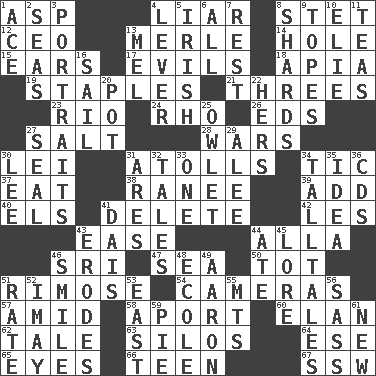 ACROSS 1. Cleo's killer 4. One who doesn't tell the truth 8. Proofreading order 12. Corporate head (abbr.) 13. Haggard of country music 14. Opening into or through something 15. Hearing organs 17. Vices 18. Capital of Western Samoa 19. Paper fasteners 21. Threesomes 23. _ de Janeiro 24. 17th letter of the Greek alphabet 26. Begley and Asner 27. Table seasoning 28. Armed conflicts 30. Flowery wreath 31. Ringlike coral islands and reefs 34. Nervous spasm 37. Ingest 38. The wife of a rajah (variant) 39. Find the sum of 40. Raised railways 41. Erase 42. French article 43. Relaxation 44. Silent film actress Nazimova 46. _ Lanka 47. Ocean 50. Small child 51. Full of chinks, cracks, or crevices 54. Devices for capturing images 57. Among 58. To the left, to Queeg 60. Flair 62. Story 63. Grain storage towers 64. Compass dir. 65. Sight organs 66. Adolescent 67. Compass dir. DOWN 1. Adept person 2. Oceans 3. Likenesses of persons 4. Prying instrument 5. From or relating to Ireland 6. 100% 7. State of inaction 8. Pottery fragments 9. Drinks excessively 10. Writer Wiesel 11. Afternoon social gatherings 13. Cartoonist voice _ Blanc 16. Move on water 20. Plant holder 22. Possessive pronoun 25. A small or young owl 27. Lick closed 29. Toward shelter 30. Area sheltered from the wind 31. Ancient Greek god of war 32. Lies 33. Single 34. Baron Munchausen's specialties 35. The content of cognition 36. Music discs 41. Raised platform 43. Eats (away) 44. Had dinner 45. Old wives' tales, e.g. 46. Grin 48. Learning spot: Fr. 49. Composer Copland 51. Pace 52. "If ____ say so..." 53. 90 degrees 55. Mountains (abbr.) 56. Backtalk 59. Sliced dessert 61. ___ Haven, CT