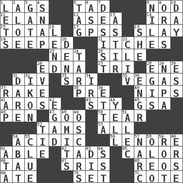 ACROSS 1. Falls behind 5. Small amount or degree 8. Allow head to fall sleepily 11. Enthusiasm 12. Toward the sea 14. Retirement account (abbr.) 15. "_____ Recall" 17. Global Positioning Systems (abbr.) 18. Kill 19. Oozed 21. Skin irritations 23. Fish or hair follower 25. Filth; sediment 26. Pulitzer Prize-winning author Ferber 27. Three (prefix) 28. Compass dir. 31. HTML Container Element 33. _ Lanka 35. Viva Las _ 37. Libertine 38. Before (prefix) 40. Cuts off 41. Came up 43. Filthy place 45. Girls' org. (abbr.) 46. Fenced enclosure 47. Thick or sticky substance 50. Pull apart 52. Scottish caps 53. Everything 54. Being or containing an acid 56. Poe poem 61. Competent 62. Small amounts or degrees 65. Bodily heat indicating an inflammation 66. The 19th letter of the Greek alphabet 67. Indian titles of respect 68. Vintage cars 69. Had dinner 70. Put into a specified state 71. ____ d'Azur (French Riviera) DOWN 1. Allows 2. Medicinal plant 3. Yard entry 4. Fastener 5. Label 6. Cleo's killer 7. Stop 8. The longest river in the world 9. Mouths or openings 10. 24 hours 13. Having gotten out of bed 16. Grant temporary use of 18. A female animal or person 20. Lairs 22. 154 in Roman numerals 24. Canvas cover 26. Nights before holidays 28. The front part of a cuirass 29. California wine valley 30. Double-curved letter 31. Have the gumption 32. Visual representation of an object 34. Big collection agency 36. Engineer (abbr.) 37. Hit sharply and swiftly 39. Singer James 42. Mild oath 44. Shout 48. Leaves out 49. Motion picture awards 51. Actor Baldwin 52. Standoff 54. Blind as ____ 55. A slight indication 57. Drug cop 58. Margarine 59. Carrot, for example 60. Celtic language 61. "One Day ___ Time" 63. Pass on 64. Fast jet (abbr.)