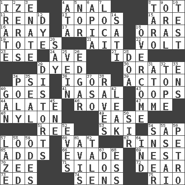 ACROSS 1. Ending with capital 4. Of or related to the anus 8. Small child 11. Tear apart 13. Traditional theme or motif 15. "We ___ not amused" (Victoria) 16. Like ___ of sunshine 17. N. Chile seaport 18. Mouths or openings 19. Hauls 21. Small island 22. Electrical Unit 23. Compass dir. 24. "___ Maria" 27. Binary compound 29. Colored 30. Declaim 34. 23rd letter of the Greek alphabet 36. Composer Stravinsky 39. Gambison 40. Travels 41. Relating to the nose 43. I made a mistake 44. Having winglike extensions 46. Be footloose 47. Madame (abbr.) 48. Thermoplastic polyamide 49. Relaxation 51. To riddle 53. What Jean-Claude Killy likes to do 54. Plant excrement 57. Spoils 60. Large container 63. Remove soap 65. Does sums 66. Dodge 69. A home for chicks 70. Last letter of the English alphabet 71. Grain storage towers 72. Letter starter 73. Begley and Asner 74. Elected reps. 75. _ de Janeiro DOWN 1. Feeling or showing extreme anger 2. Nothings 3. Maternal 4. "One Day ___ Time" 5. Not either 6. Capital of Western Samoa 7. Event scenes 8. Pacific island yam 9. Relating to the mouth 10. Trial 12. Color 14. Suttee (variant) 18. Conquer 20. Declare 25. Distinctive style or manner 26. _ Allan Poe 28. ___ good deed 29. What propaganda does 31. Tiny particle 32. Drink excessively 33. Followers of ems 34. More than one (prefix) 35. Lick closed 37. Bear (Spanish) 38. All-night dance parties 40. Separate the seeds from cotton 42. Path through which fluid escapes 45. Compass dir. 50. Title for a knight 52. Nights before holidays 54. Contemptuous expression 55. Slender Brazilian palm 56. Stone: prefix 57. Goldbrick 58. Wrote a lyric poem 59. Lyric poems 61. Opinion 62. Falsehood 64. Working for oneself (abbr.) 67. Spanish title 68. Double-curved letter