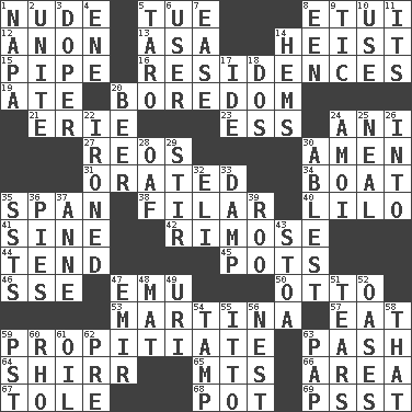 ACROSS 1. Unadorned 5. Third day of the wk. 8. Needle holder 12. At once, immediately (arch.) 13. White ___ sheet 14. Robbery 15. Corncob 16. Dwellings 19. Had dinner 20. Mood resulting from idleness 21. 4th largest of the Great Lakes 23. Double-curved letter 24. Cuckoo 27. Vintage cars 30. So be it 31. Declaimed 34. Water vessel 35. Connect, as a bridge 38. Having threads 40. _ and Stitch 41. Trig term 42. Full of chinks, cracks, or crevices 44. Be inclined (to) 45. Plant holders 46. Compass dir. 47. Australian flightless bird 50. Von Bismarck 53. Chrissie's court nemesis 57. Ingest 59. Conciliate 63. Romantic infatuation 64. Bake eggs in their shells 65. Mountains (abbr.) 66. Type of rug 67. Lacquered or enameled metalware 68. Cooking vessel 69. Inconspicuous attention getter DOWN 1. California wine valley 2. Join together 3. Drug addict 4. Compass dir. 5. Edible starchy tuberous root 6. One who uses or employs something 7. Relaxation 8. Car or cant ending 9. Nervous spasm 10. Purpose 11. It is 14. Folds over and sews together 17. Binary compound 18. Two (Sp.) 20. Fermented drink made from hops 22. Pressed 24. Mine, in Marseilles 25. Be tempered by heat 26. To the inside or interior of 28. Clumsy lout 29. Use a spoon 30. Most capable 32. Connecticut Ivy Leaguer 33. Moist 35. Fast planes 36. Sliced desserts 37. Singer Murray 39. Friend of Pooh 43. Portico 47. Independent ruler or chieftain 48. Floor covering 49. RI univ. 51. Lacerates 52. Fertile tracts in a desert 54. Pack (down) 55. "Tell ____ the Marines!" 56. A home for chicks 58. Not this but _ 59. Pacific Standard Time (abbr.) 60. 17th letter of the Greek alphabet 61. Petroleum 62. Before (prefix) 63. Infant food