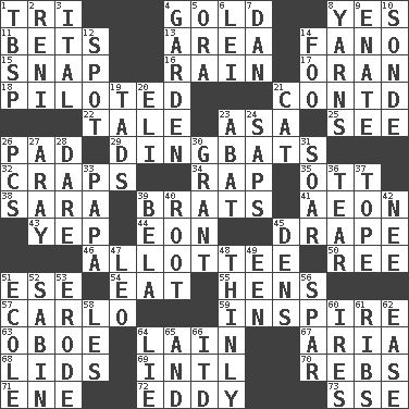ACROSS 1. Three (prefix) 4. Aureate 8. It is so 11. Wagers 13. Length times width 14. Papal veil 15. Fastener 16. Precipitation 17. Northwest Algerian city 18. Manned the helm 21. Continued (abbr.) 22. Falsehood 23. White ___ sheet 25. Observe 26. Writing tablet 29. Empty-headed or silly people 32. Dice game 34. Hit sharply and swiftly 35. Baseball player Mel 38. "Two Mules for Sister ____" 39. Naughty children 41. A really long time 43. Slangy assent 44. Period of immesurable duration 45. Window treatment 46. One to whom something is allotted 50. Portuguese money of account (variant) 51. Compass dir. 54. Ingest 55. Coop moms 57. Monte _, Las Vegas Hotel/Casino 59. Stimulate to action 63. Mitch Miller's instrument 64. (Had) reclined 67. Roberta Peters solo 68. Flaplike coverings 69. International (abbr.) 70. Confederate soldiers (slang) 71. Compass dir. 72. Whirlpool 73. Compass dir. DOWN 1. Cook's measure (abbr.) 2. Painter Guido (1575-1642) 3. Slanted text style (abbr.) 4. Place where plants grow 5. Mouth or opening 6. Luau accessory 7. One of the 12 tribes of Israel 8. Entertaining tales 9. Related on the mother's side 10. Something which is sent 12. Blemish 14. Egg _ yung 19. Small amounts or degrees 20. Connecticut Ivy Leaguer 21. Domesticated feline 23. Blind as ____ 24. Plant excrements 26. Personal Computers (abbr.) 27. Like ___ of sunshine 28. Have the gumption 30. Monetary aid 31. Fly high 33. Dad 36. Pull apart 37. Drink excessively 39. Actor Lugosi 40. Carrot, for example 42. Born 45. Cub Scout units 47. Lion 48. Without thickness 49. Car or cant ending 51. Learning spot: Fr. 52. Unit of acoustic absorption 53. Eat (away) 56. Practice fight 58. French article 60. Angers 61. Teases 62. Relaxation 64. Untruth 65. Added to 66. It would