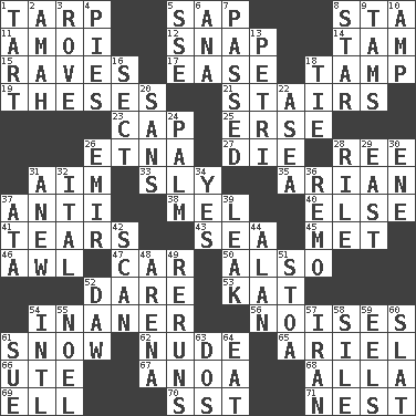 ACROSS 1. Canvas cover 5. Plant excrement 8. R.R. building 11. Mine, in Marseilles 12. Fastener 14. Scottish cap 15. All-night dance parties 17. Relaxation 18. Pack (down) 19. College papers 21. Flight of steps 23. Head covering 25. Celtic language 26. Inactive volcano in Sicily 27. Expire 28. Portuguese money of account (variant) 31. Direct toward a target or goal 33. Wily 35. Believer in; advocate of (suffix) 37. Against 38. Cartoonist voice _ Blanc 40. Otherwise 41. Pulls apart 43. Ocean 45. Was introduced to 46. Leather borer 47. 4-wheeled motor vehicle 50. In addition 52. Have the gumption 53. Krazy ___ of comics 54. Sillier 56. Annoying sounds 61. Frozen precipitation 62. Naked 65. Satellite of Uranus 66. Shoshoni 67. Small Philippine buffalo 68. Silent film actress Nazimova 69. Pipe bend 70. Fast jet (abbr.) 71. A home for chicks DOWN 1. Small pie 2. Nursemaid 3. Be footloose 4. Sliced desserts 5. Compass dir. 6. Santa ___, CA 7. Went by 8. Play the lead 9. Scottish caps 10. Electrical Unit 13. _ dish (used to culture cells) 16. Religious group 18. Standoff 20. Without 22. At sea 24. Inside of hand 26. Independent ruler or chieftain 28. Cause heat under the collar 29. Compass direction 30. Compass dir. 31. Afresh 32. Slanted text style (abbr.) 34. It is so 36. San ____ (Riviera town) 37. _ moment's notice (2 wds.) 39. Path through which fluid escapes 42. Glance over 44. Actor Alda or Thicke 48. Sports stadium 49. Summer TV shows 51. Portico 52. Fool 54. International (abbr.) 55. Christmas carol 57. SW Asia republic 58. Drop; flow; fall 59. Snakelike fish 60. Narrow board 61. Institute legal proceedings 63. Two (Sp.) 64. Consume