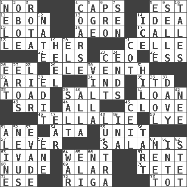 ACROSS 1. And not 4. Smile enhancers 8. Eastern Standard Time (abbr.) 11. Inky black, to poets 13. Legendary monster 14. The main thing one is thinking about 15. Globular water bottle used in Asia 16. A really long time 17. Give a ring to 18. Cordwainer's material 21. Cell (Danish) 22. Snakelike fish 23. Corporate head (abbr.) 25. Double-curved letter 26. Snakelike fish 29. Veterans Day date 32. Satellite of Uranus 34. Indiana (abbr.) 35. It would 38. Frog relative 39. Table seasonings 41. Grant temporary use of 43. _ Lanka 44. Everything 45. Garlic unit 46. Copy Pinocchio 50. Sodium hydroxide 51. One (Scot) 54. _ moment's notice (2 wds.) 55. A single undivided whole 57. Prying instrument 59. Deli grouping 63. "Terrible" tsar 64. Gone 67. Monthly bill 68. Unadorned 69. Having or resembling wings 70. False hair 71. Compass dir. 72. Capital of Latvia 73. Small child DOWN 1. 1994 drama film starring Jodie Foster 2. Mitch Miller's instrument 3. Roll call or roster of names 4. Unrefined 5. Grow older 6. Adept person 7. Elected rep. 8. Peak District village in England 9. Exchanges for money 10. Lies 12. Nathan's nickname 14. Frozen water 19. The bottom of a shoe or boot 20. Pipe bend 21. Small bed 23. Penny 24. Conclusions 26. Erode 27. Greek god of love 28. One who doesn't tell the truth 30. Country residence 31. Land elevation 33. Prepare for publication 36. Implement 37. American folk hero Crockett 39. Table seasoning 40. Silent film actress Nazimova 42. Born 45. To provide with a ceiling 47. Ewer handle 48. A period of five years 49. _ tizzy (2 wds.) 51. Place in a line 52. Mole, birthmark 53. Elude 56. Small pie 58. Compass dir. 60. Rendezvous 61. To the inside or interior of 62. Proofreading order 64. Armed conflict 65. Biblical high priest 66. Tired old horse