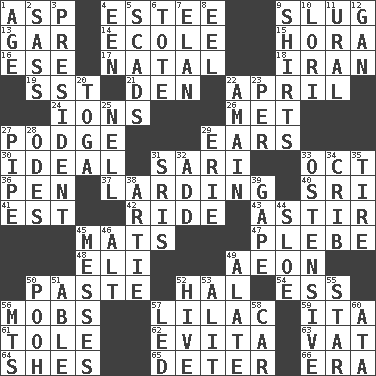 ACROSS 1. Viper 4. First name in cosmetics 9. Strike heavily 13. Slender fish 14. Learning spot: Fr. 15. Israeli folk dance 16. Compass dir. 17. Relating to or accompanying birth 18. SW Asia republic 19. Fast jet (abbr.) 21. Lair 22. Showery time 24. Charged particles 26. Was introduced to 27. Puddle 29. Hearing organs 30. Standard of perfection 31. Indian skirt 33. Sep. follower 36. Writing instrument 37. Preparing or cooking with lard 40. Indian title of respect (Mr.) 41. Eastern Standard Time (abbr.) 42. Travel on or in a vehicle 43. Being in motion 45. Floor coverings 47. First-year military academy student 48. Connecticut Ivy Leaguer 49. Period of immesurable duration 50. Thick mixture 52. Actor Linden 54. Double-curved letter 56. Crowds into 57. Pale purple color 59. Call ___ day 61. Lacquered or enameled metalware 62. Webber/Rice musical 63. Large container 64. "______ My Girl" (Turtles hit) 65. Prevent from occurring 66. Period DOWN 1. Grow older 2. Backtalk 3. Elected leader of a country 4. Car or cant ending 5. Large numbers or amounts 6. Haul 7. Liveliness 8. Snakelike fish 9. Upper-body garments 10. Australian parrot (variant) 11. Mountain range 12. Separate the seeds from cotton 20. Ancient Roman robe 22. With great haste 23. For each 25. 1994 drama film starring Jodie Foster 27. Corncob 28. Lyric poems 29. One of the Great Lakes 31. Indian titles of respect 32. Find the sum of 33. Clearly or manifestly demonstrative 34. Baby bed with high sides 35. Hoop that covers a wheel 38. Nick name for Arthur 39. Stare wonderingly 44. A type of plum 45. Makes clutter 46. Keyboard modifier key 49. Having winglike extensions 50. "Silly old bear" 51. Competent 52. Hub of activity 53. Set down 55. Play the lead 56. Mountains (abbr.) 57. Directed 58. Auto 60. "One Day ___ Time"