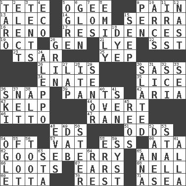 ACROSS 1. Wig 5. Double curve, resembling the letter S 9. Ache 13. Actor Baldwin 14. Take by theft 15. Father Junipero _ 16. Western Nevada city 17. Dwellings 19. Sep. follower 20. Commissioned military rank (abbr.) 21. Sodium hydroxide 22. Fast jet (abbr.) 23. Russian ruler of old 25. Slangy assent 26. Ms. Damita and namesakes 30. Backtalk 34. Maternal 35. Louse (plural) 36. Fastener 39. Leg coverings 42. Roberta Peters solo 43. Seaweed 44. Unconcealed 46. "Tell ____ the Marines!" 47. Indian princess (variant) 48. Begley and Asner 51. Probability 54. Often (poetically) 57. Large container 58. Curvy letter 60. "One Day ___ Time" 62. Sour, prickly fruit 65. Of or related to the anus 66. Plunders 67. Hearing organs 68. 1994 drama film starring Jodie Foster 69. Singer James 70. State of inaction 71. At sea DOWN 1. Pacific island yam 2. Opt 3. Portable shelters 4. Environmental prefix 5. Legendary monster 6. Small, secluded valley 7. Greek goddess of the dawn 8. Poet Dickinson 9. Animal enclosure 10. Arches 11. Angers 12. Political cartoonist Thomas 15. Ooze 18. Color 20. Smile widely 24. City in Syria 27. Pet locale 28. Call ___ day 29. Sir (Sp.) 30. Scheduled 31. Atmosphere 32. _-fi 33. Ocean 36. What Jean-Claude Killy likes to do 37. Remaining after all deductions 38. Keyboard modifier key 40. Federal power corp. 41. Elected rep. 45. Vintage cars 48. Nights before holidays 49. Small moist lump or mass 50. Bull 52. Natives or inhabitants of Denmark 53. Lacking originality or spontaneity 54. Stare 55. One third of a yard 56. A blast of a horn 58. Blunders 59. System (abbr.) 61. Silent film actress Nazimova 63. R.R. building 64. Actress Charlotte 65. Santa ___, CA